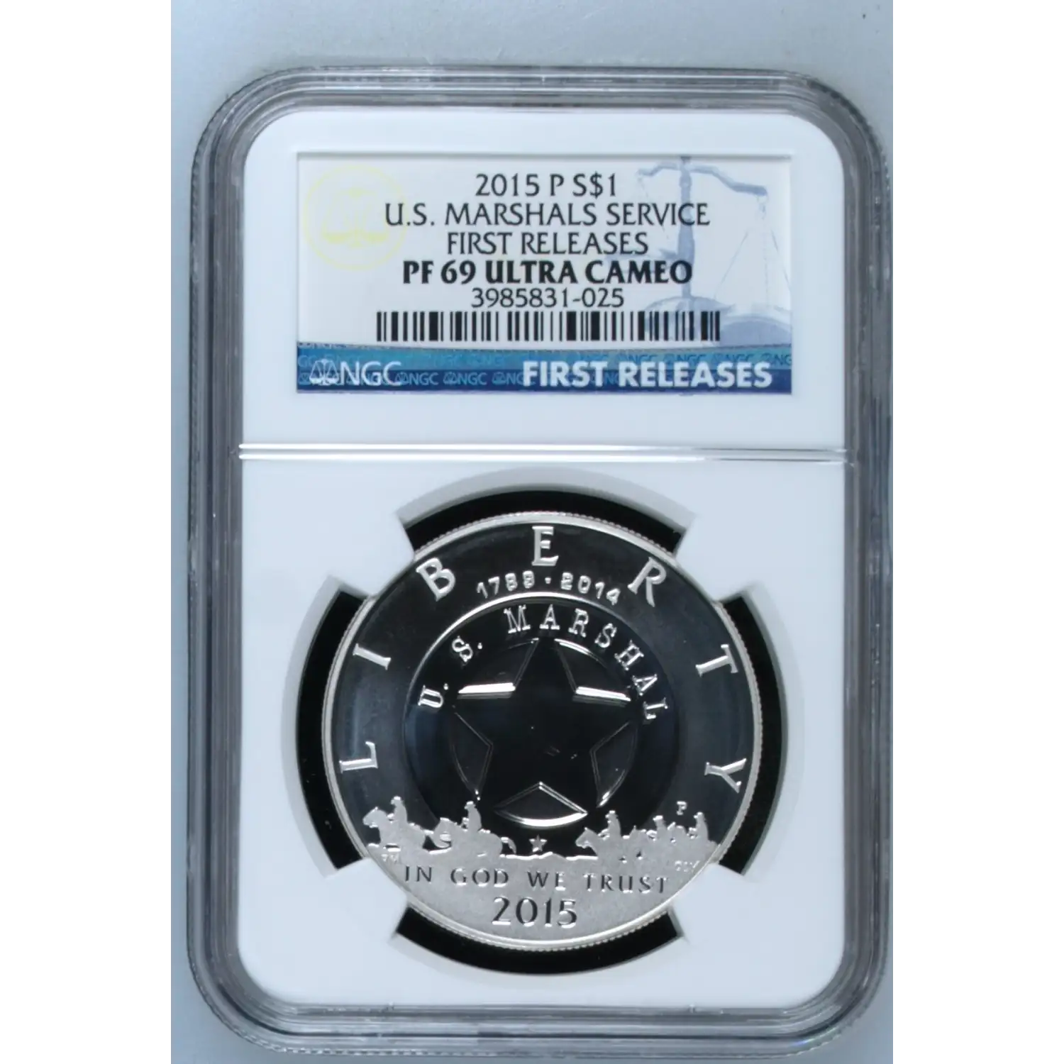 The 2015-P Silver dollar is part of a series of Modern Commemorative coins struck from 2015. The specific variety is U.S. Marshals Service 225th Anniversary. Struck in Philadelphia and designated as a Proof (PR) strike, this coin is made of 90% silver, 10% copper from a mintage of 124,329 struck.