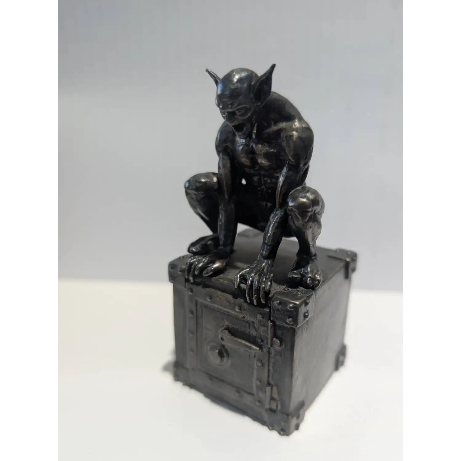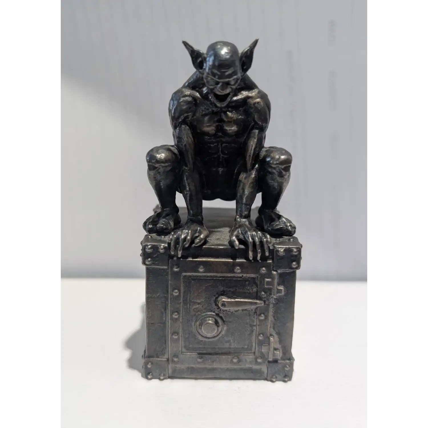 These 13 oz Antique Finish Godric the Gargoyle Silver Statues feature original artwork created by award-winning character artists, and master sculptor, Rafael Fernandez. There are incredible details used in this statue that include an oversized old-fashioned safe that includes texture to the handles, hinges, and rivets.