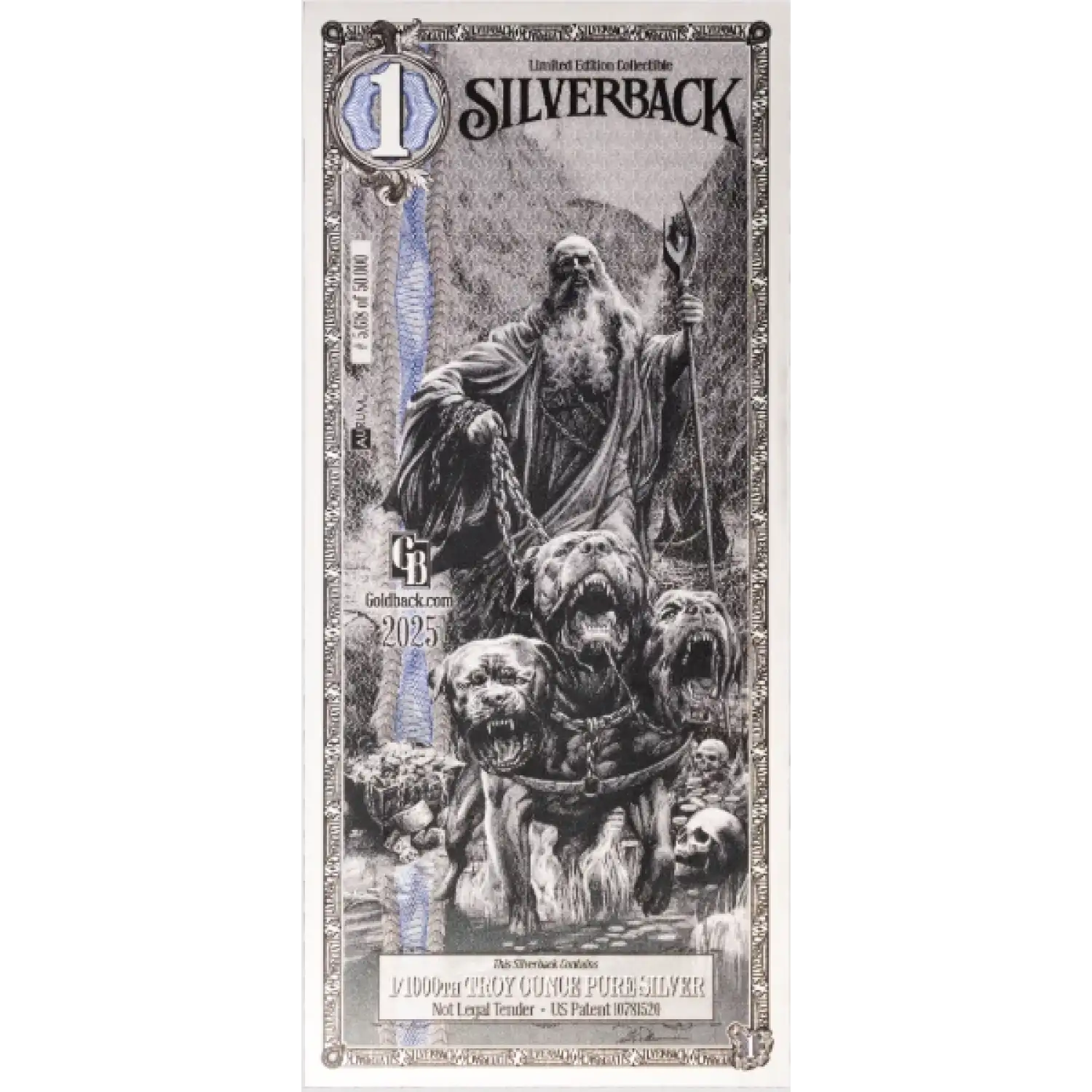 Arrives in a plastic currency sleeve or a pack of 100 notes! 1st release in the new Legends of Olympus Series! Features an image of Hades! Limited issue of only 50,000 notes!Contains 1/1000 troy oz of .999 pure silver. The obverse features Hades with his fearsome three-headed dog. On the reverse is a mirror image of the primary design.Silverbacks are NOT legal tender.