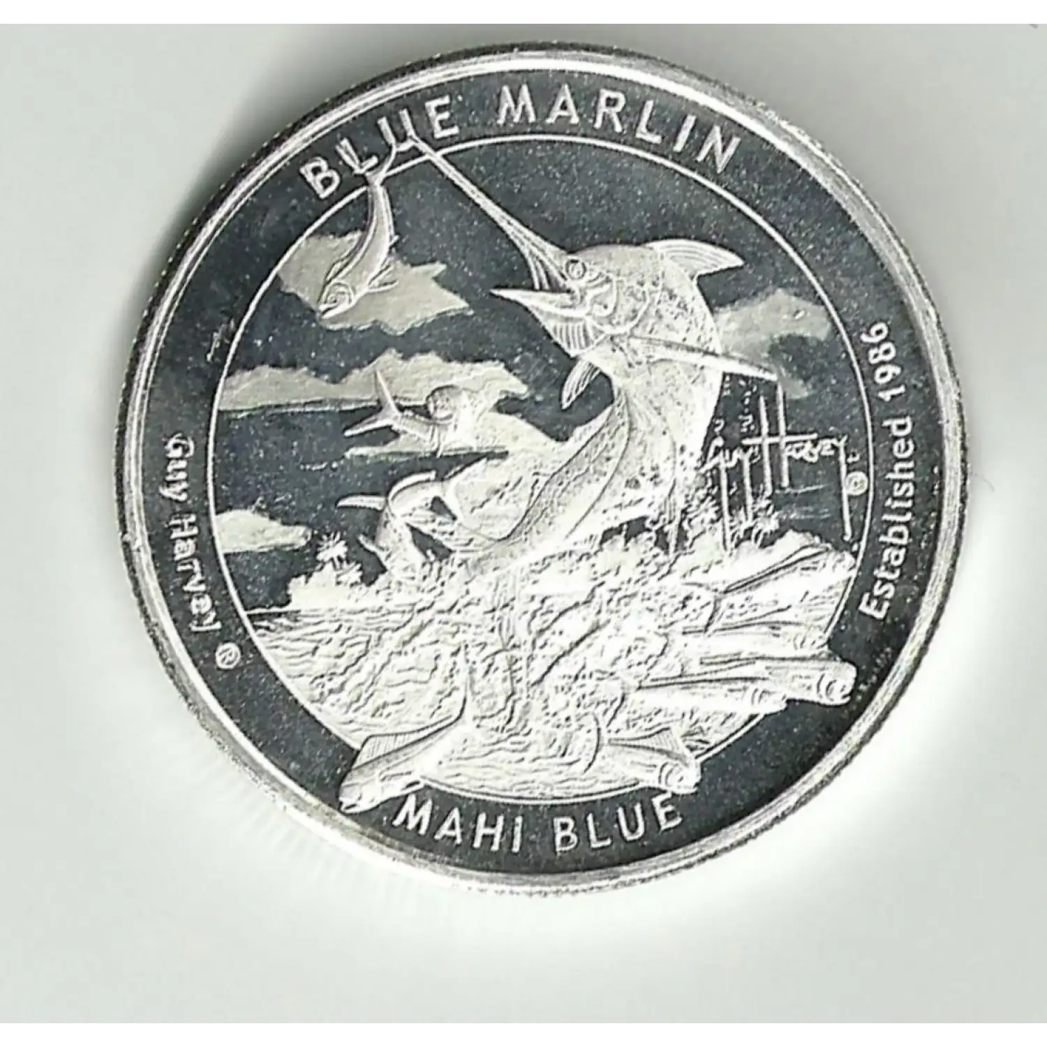 The principal design for Series I of the Guy Harvey silver bullion line is the blue marlin, one of the most beautiful prize fish found in the open ocean. With its long sword and purple dorsal fin, the marlin is emerging from the water, mouth agape, body twisting toward the left, as a group of dorado (mahi-mahi) are fleeing in different directions from the powerful predator. Dorado, meaning “golden” in Spanish, get their name due to their shimmering, golden color. The waves of the sea and the splashing water from the blue marlin’s leap above the surface are shown in great detail, while a tropical shoreline and a cloudy sky fill in the background. Despite having few natural predators besides human beings, blue marlins are currently a threatened species due to their attractiveness to commercial fishermen.