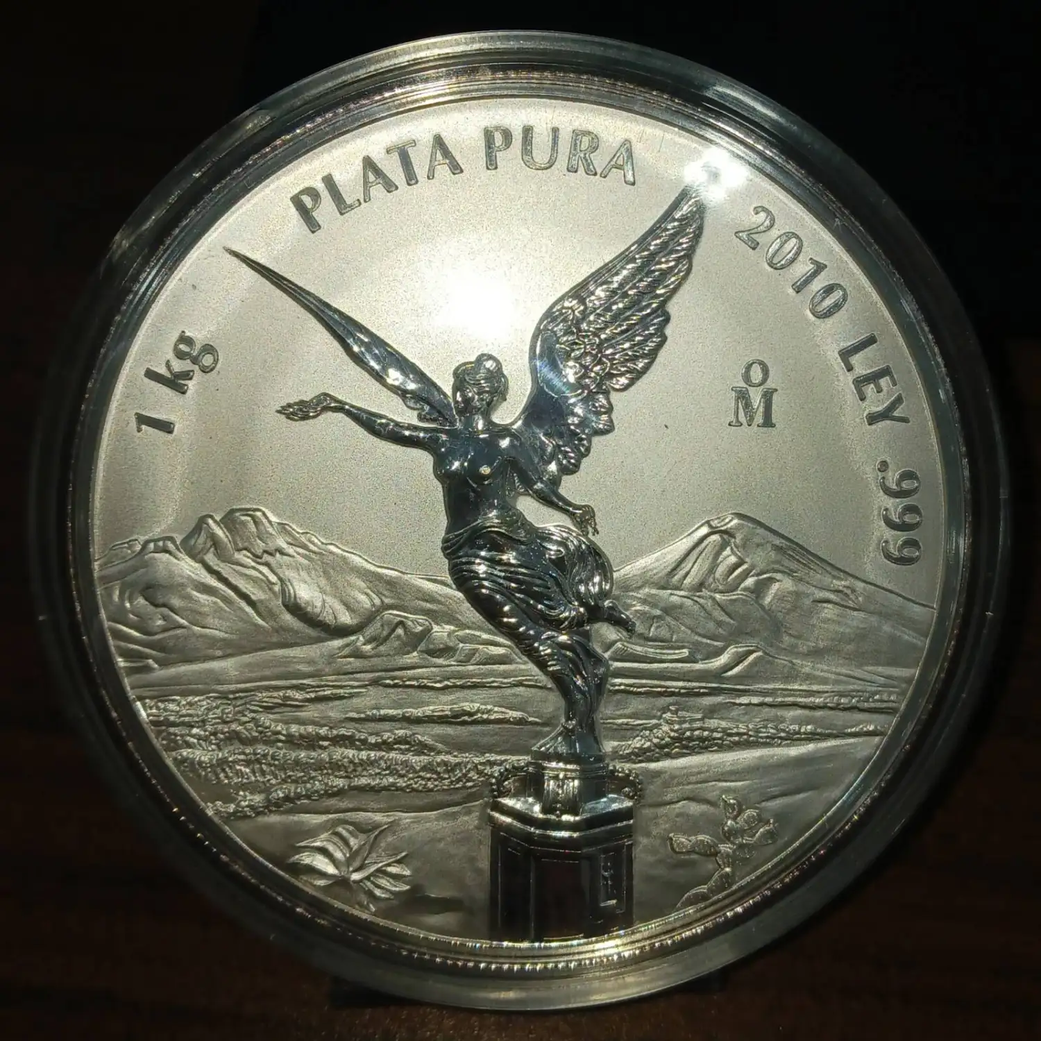 The reverse of 2010 1 kg Mexican Silver Libertad Coin contains a statue of Winged Victory. If you visit downtown Mexico City, you will see the real-life version of this statue placed atop the Angel of Independence monument. This reverse design is set against a backdrop of the Popocatepetl and Iztaccihuatl volcanic mountains. Inscriptions are also shown on the reverse that read 1 kg Plata Pura 2010 Ley .999.