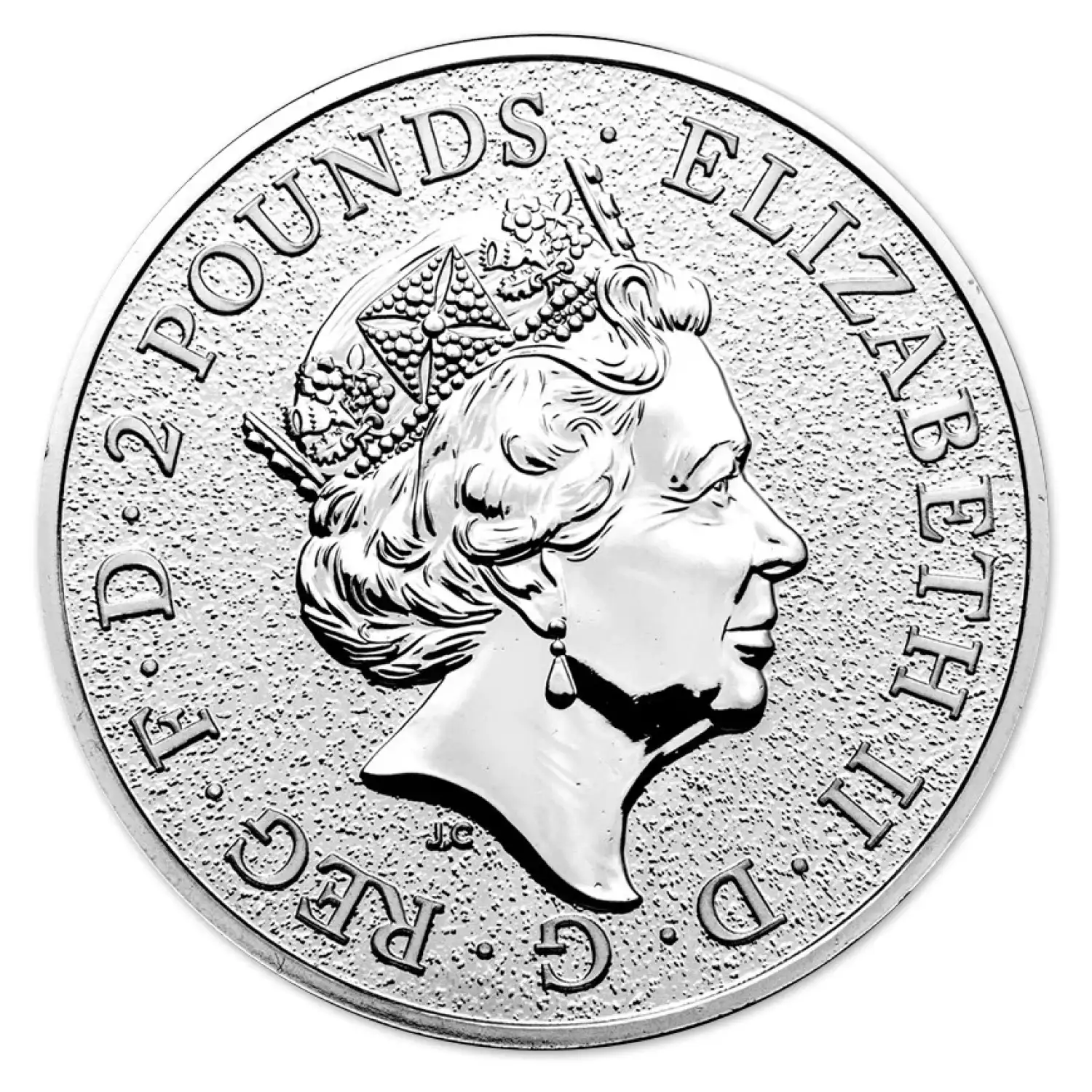 The obverse of the coin displays the effigy of Her Majesty Queen Elizabeth II, designed by Jody Clark. This portrait, used on UK coinage beginning in 2015, shows the Queen in a right‑facing profile wearing the royal diadem. Inscriptions include Elizabeth II, D.G. Reg. F.D., and the coin’s monetary denomination.