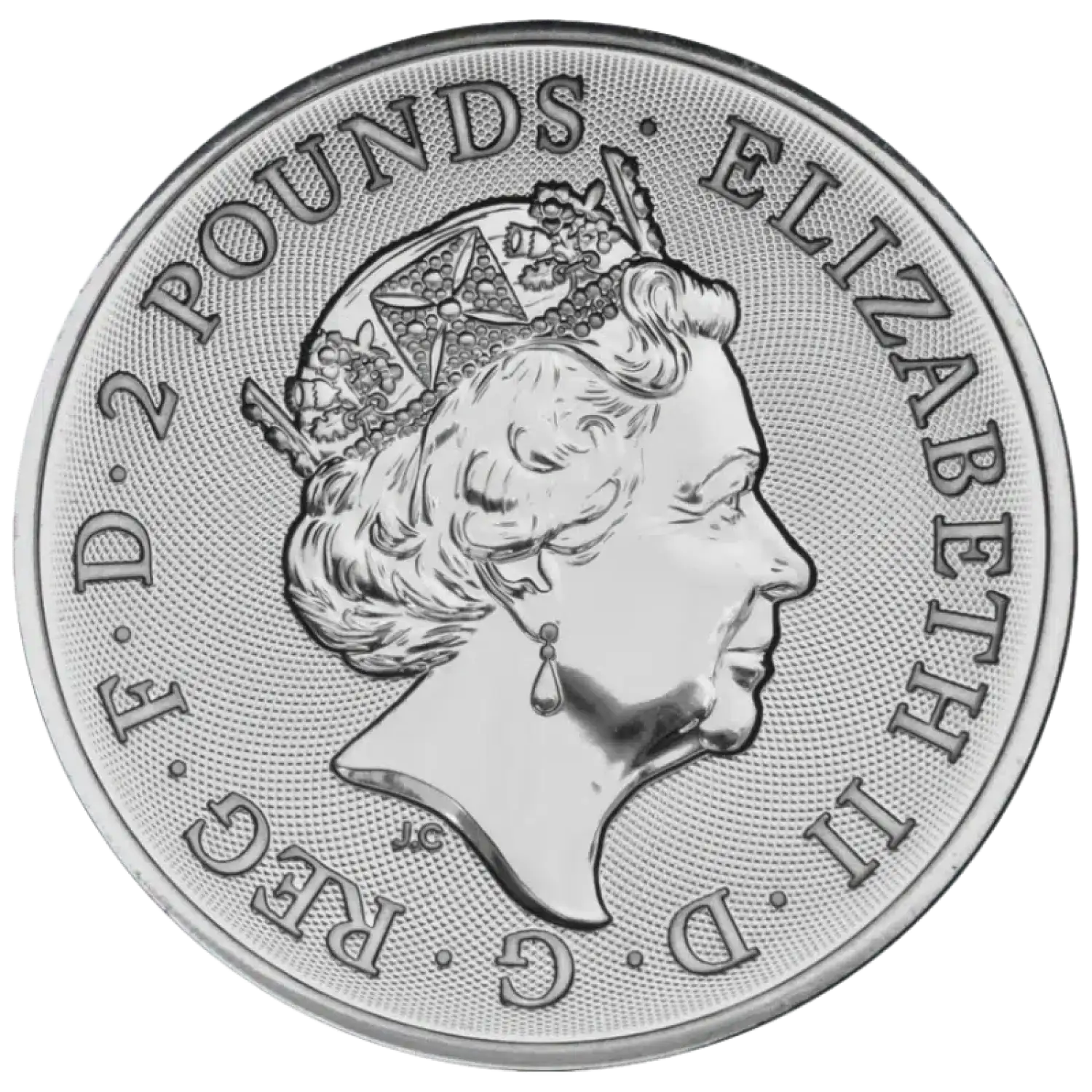 The obverse of the coin features the fifth‑generation effigy of Her Majesty Queen Elizabeth II, created by Jody Clark. This right‑facing portrait includes the Queen’s royal diadem and is surrounded by inscriptions denoting her name, the coin’s denomination, and the year of issue.
