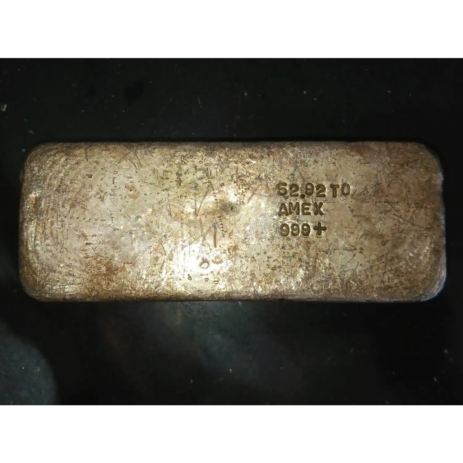 Amex 52.92 oz Poured Silver Bars appeal to investors and collectors for many years. The Amex 52.92 oz Poured Silver Bar is composed of 52.92 troy ounces of .999 fine silver. This Classic and rustic silver bar features a handstamped, weight, and purity.