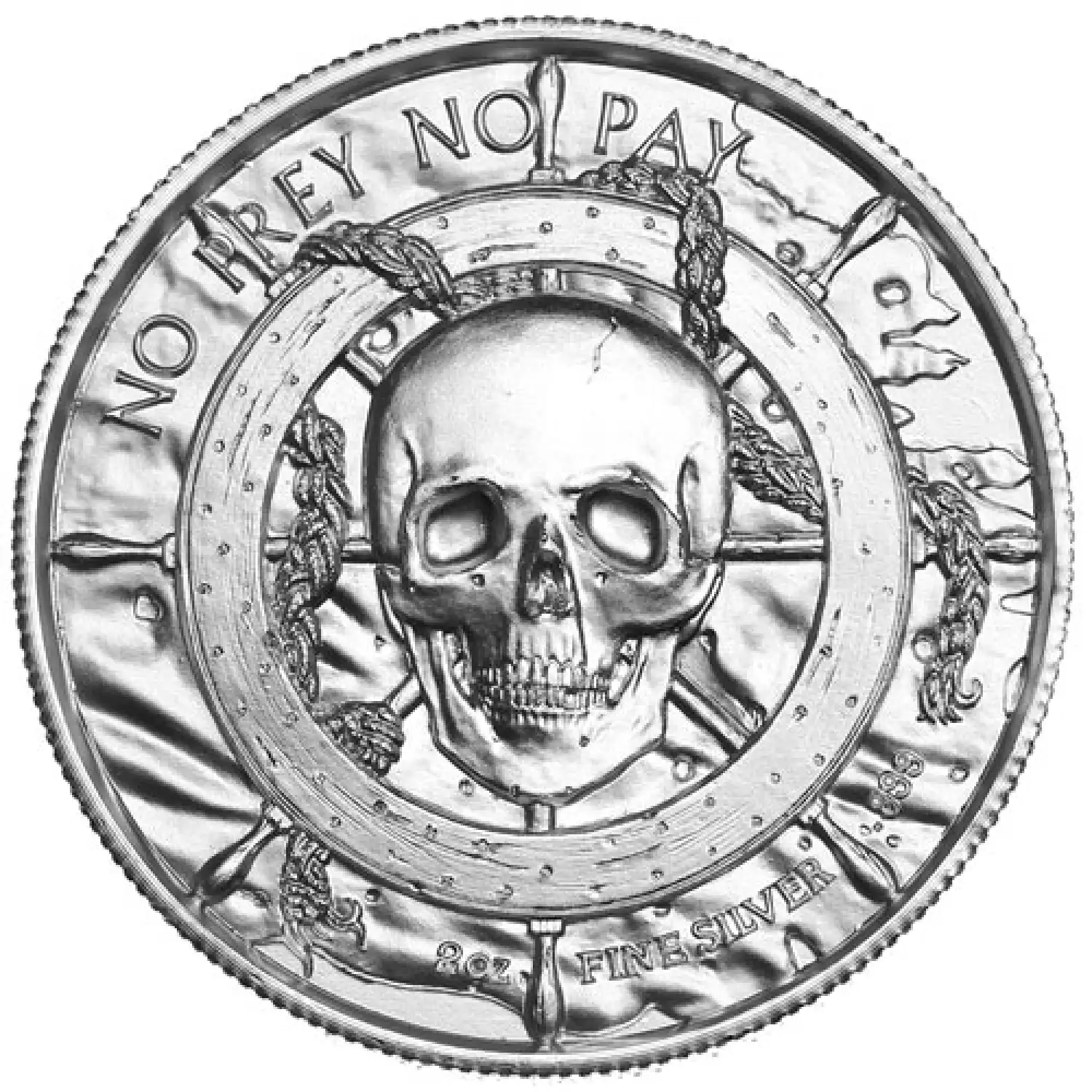 On the obverse side of the round is the standard design featured on all Privateer Series silver rounds. Mimicking the Jolly Roger imagery, a human skull is set in the center of a ship’s wheel. Above the wheel is the motto of pirates everywhere, “No Prey, No Pay.” Below, the weight, metal content, and purity of the coin are engraved.