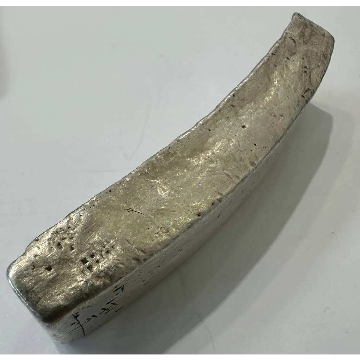Cast mainly from melted Spanish-American 8 Reales, Indian Rupees, and French Indochina Piastres, they assay consistently .991 fine. A typical weight is generally in the 350-380 grams range, with a likely standard of 380 gm. The size is typically 110mm x 31mm x 14mm, except the early class which is longer and thinner.