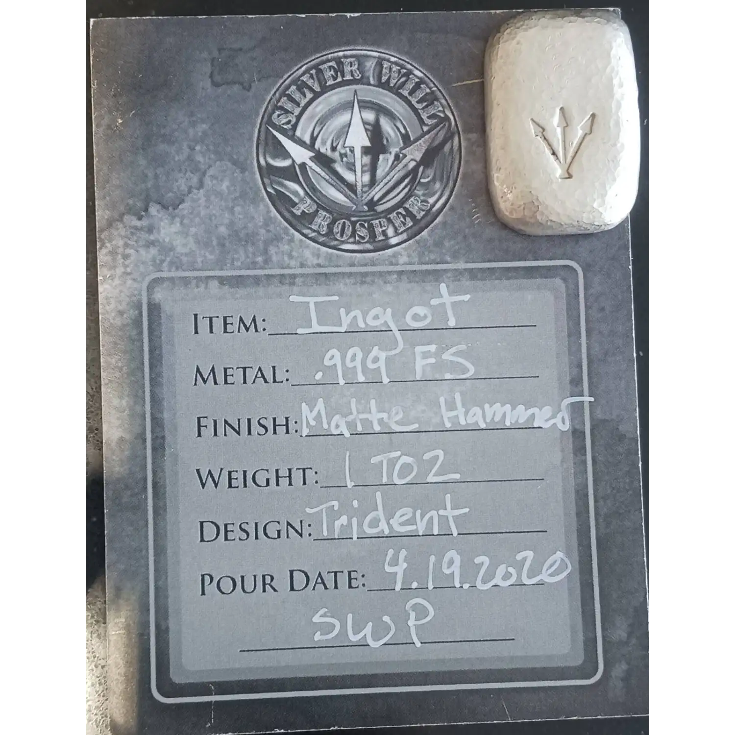 Made by Silver Will Prosper "Trident" 1oz .999 Silver Ingot.