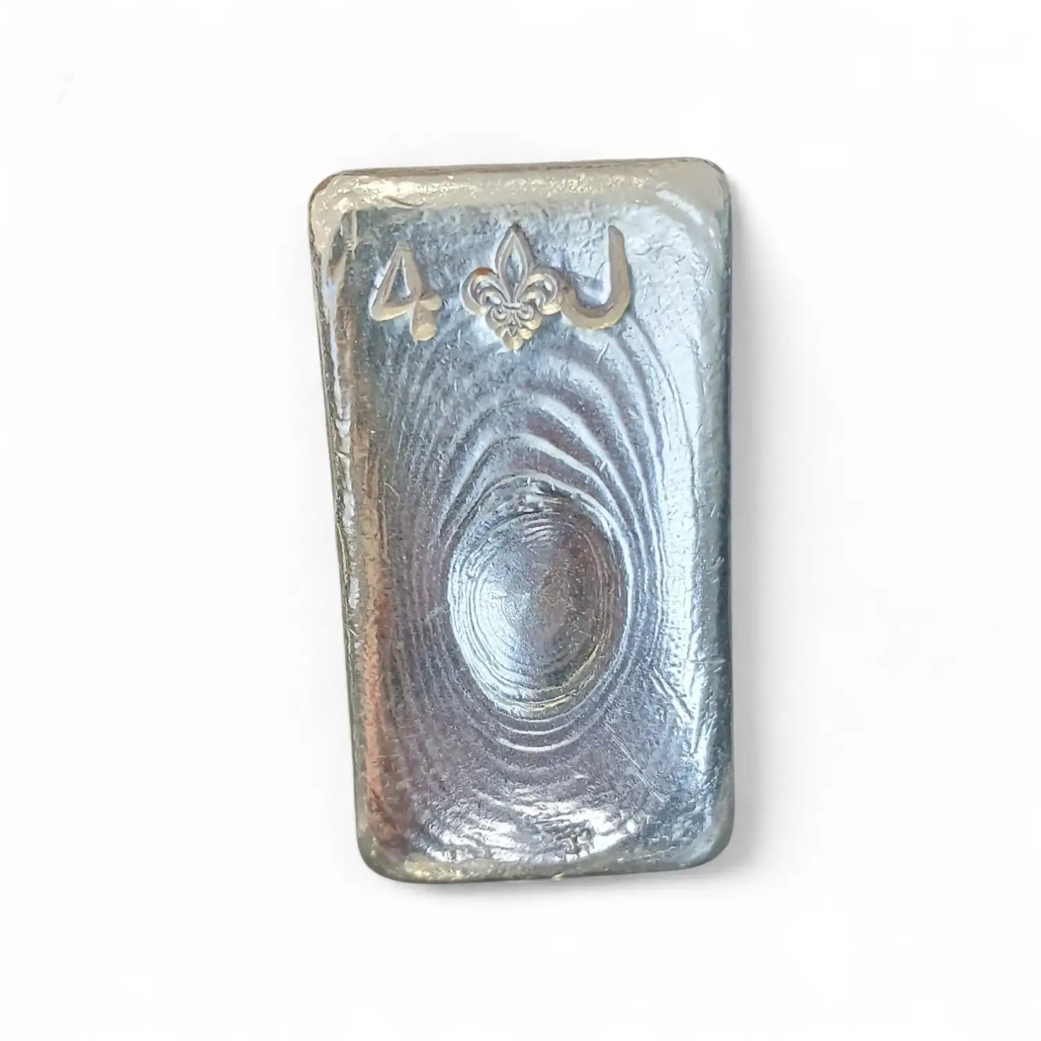 This bar is a vintage and rustic pour, made by a private manufacturer. The maker's mark is a Fleur de Lis motif, a traditional symbol of French descent, designed after a stylized lily. An interesting bar to add to any existing or growing silver stack.