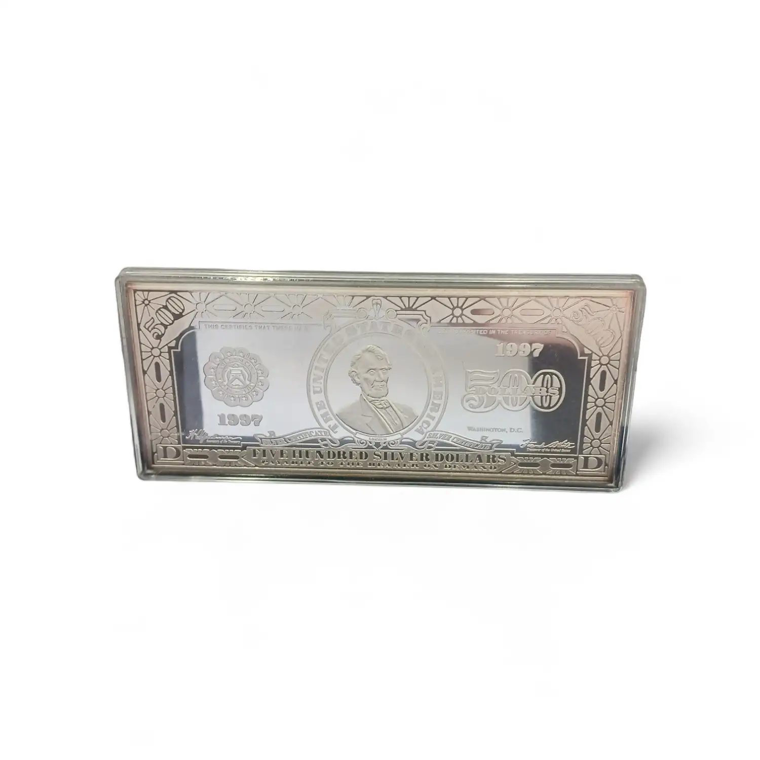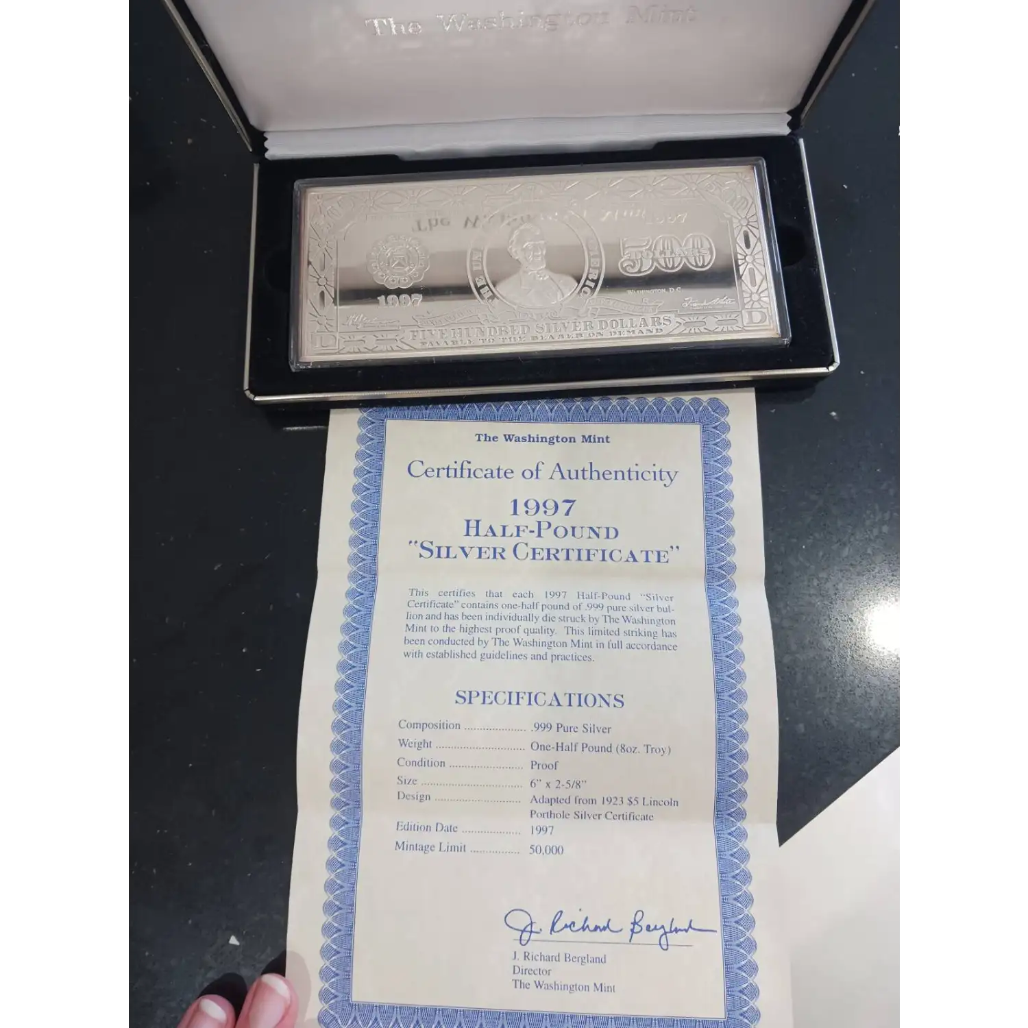 1997, $500 Half Pound Silver Certificate Bar, w/Box & COA | Washington Mint