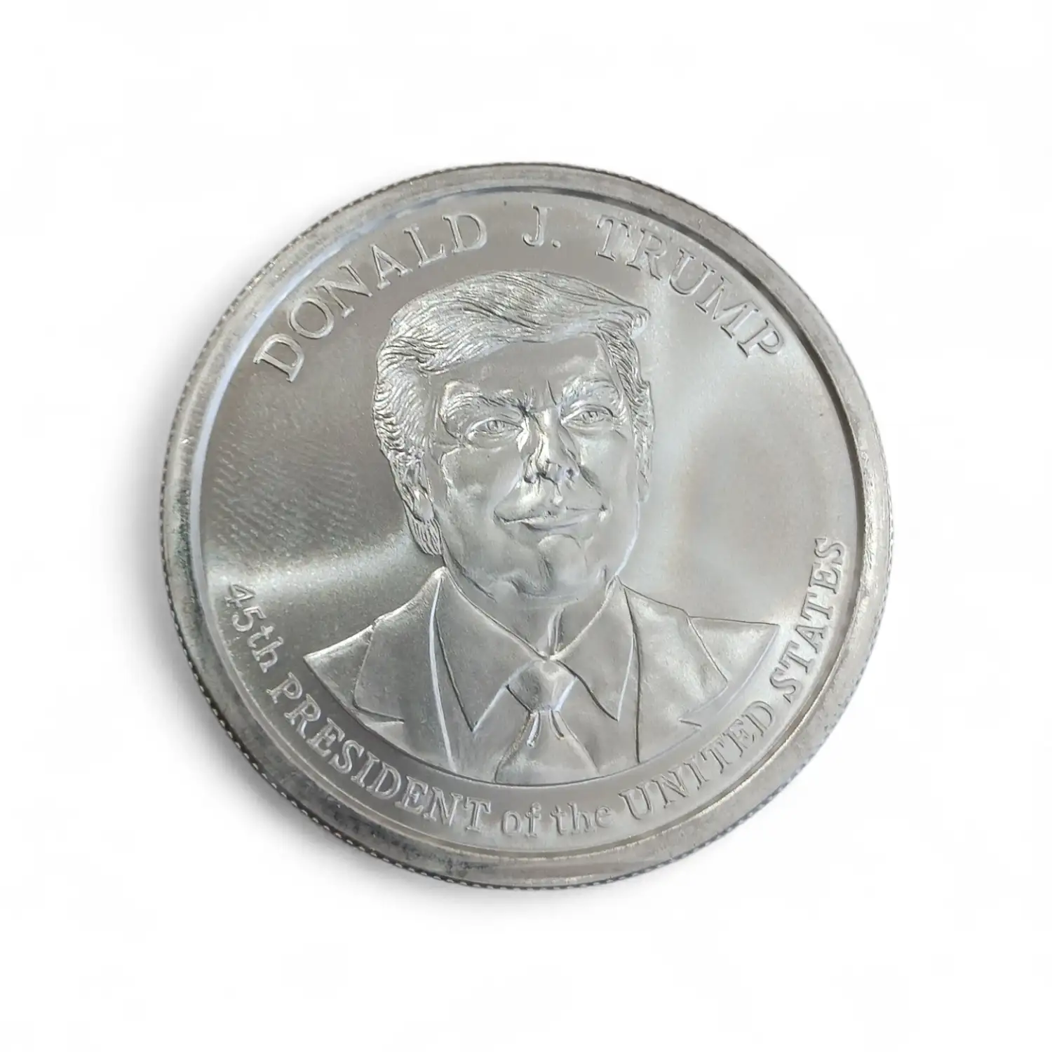 The obverse features Donald J, Trump with inscriptions DONALD J. TRUMP and 45TH PRESIDENT OF THE UNITED STATES.