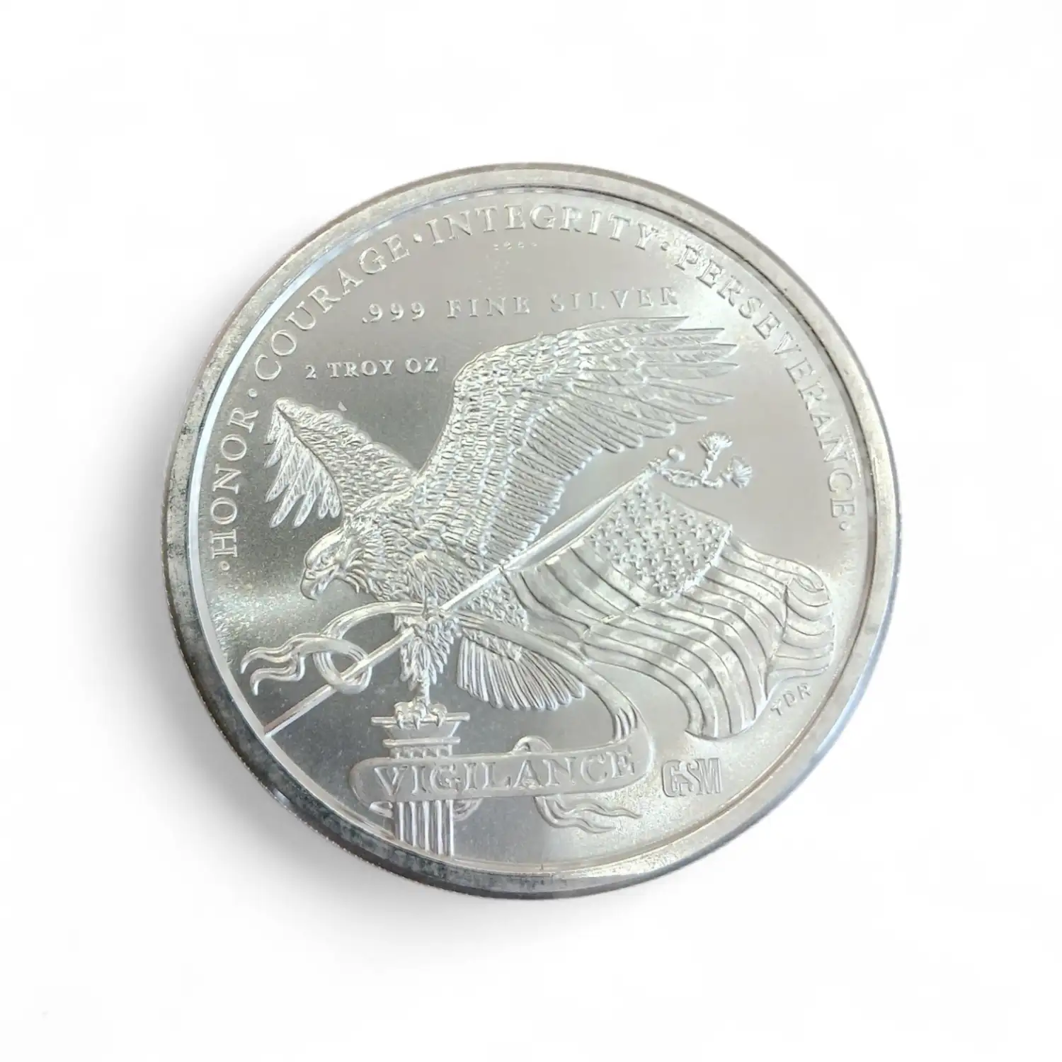 The reverse features an eagle carrying the Flag with inscriptions 2 TROY OZ, .999 FINE SILVER, HONOR, COURAGE, INTEGRITY, PERSEVERANCE, VIGILANCE and GSM.Coin Specifications: