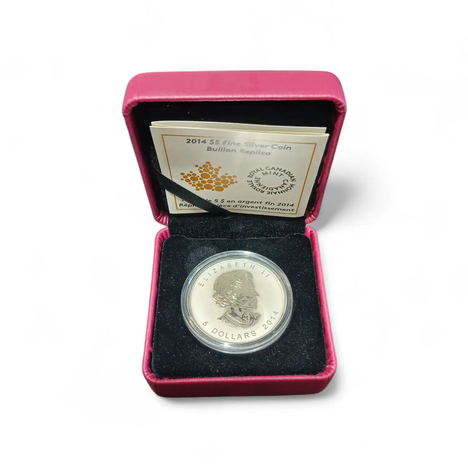 The obverse of the coin features the likeness of Queen Elizabeth II and the reverse displays one of Canada's most popular symbols, the maple leaf and weight and purity of the Silver coin.