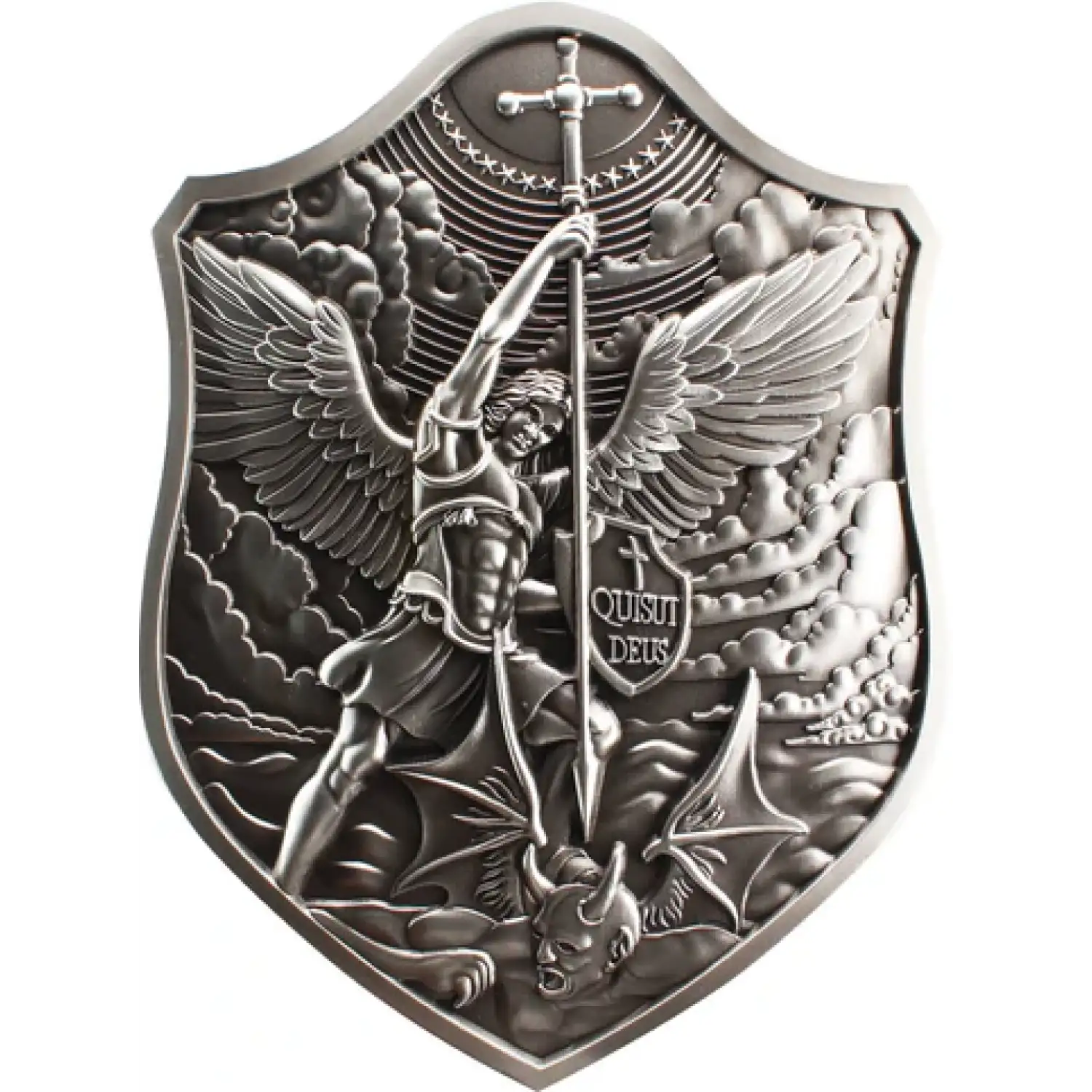 St. Michael is the most famous archangel from the ranks of angels in Heaven. His exploits are accurately detailed in the Book of Revelation as he leads the forces of God against Satan and the other downfallen angels. In the latest 2 oz Silver Stacker Release, a Shield of St. Michael design is available with a beautiful, detailed design.