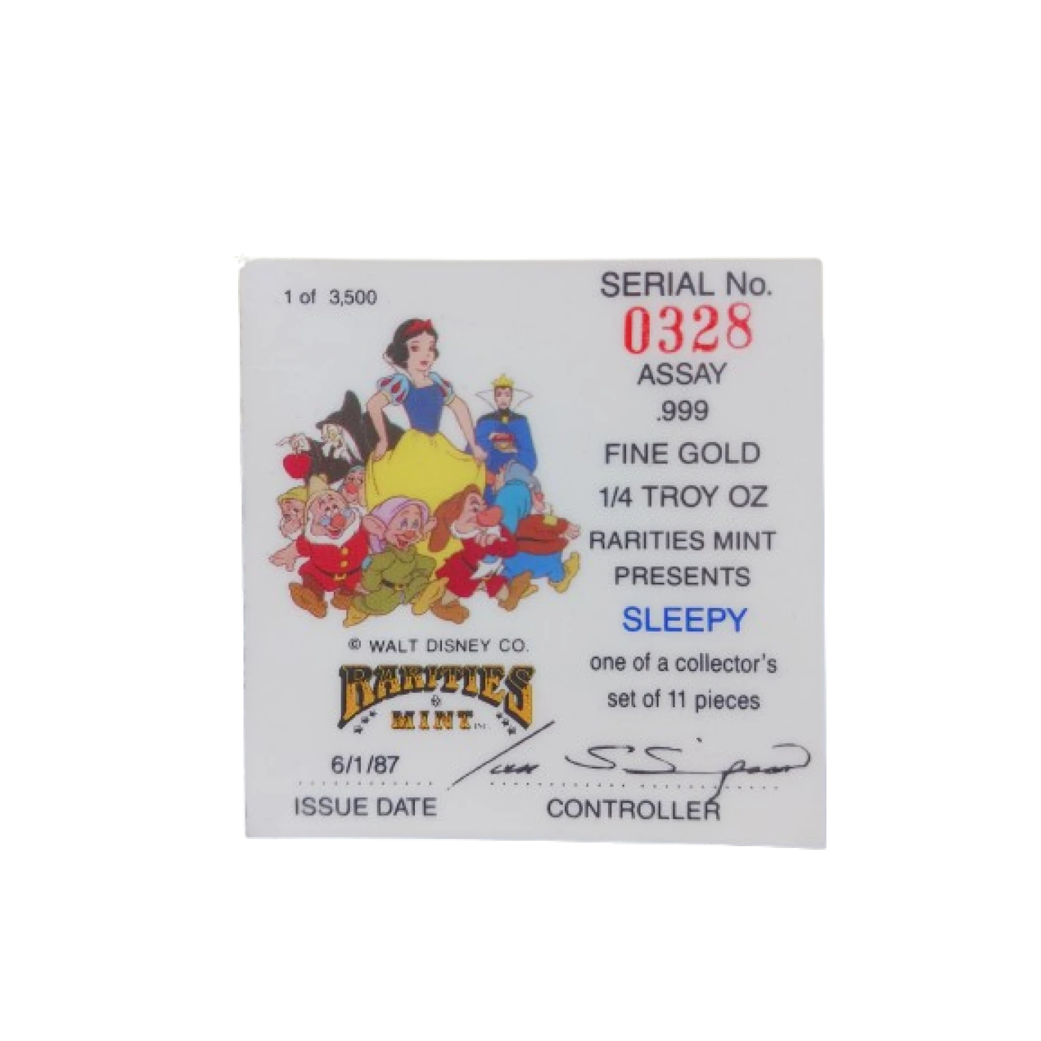 This round was originally sold as part of a collector’s set in 1987 that featured 11 pieces. This round features "Sleepy" one of the seven dwarfs and commemorates the 50th anniversary of Snow White, which was first released in 1937 by Walt Disney.