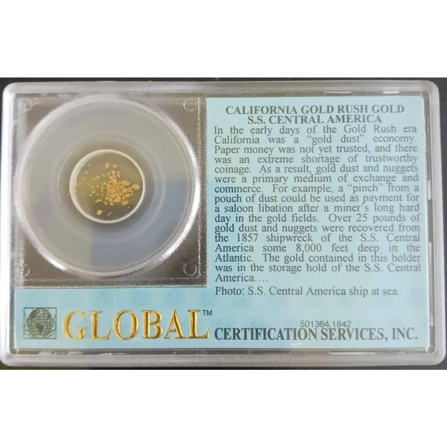 The SS Central America is potentially the most legendary shipwreck in numismatic circles, dubbed at the time of it's discovery as 'The Greatest Treasure Ever Found!' It met it's fate when it sunk off the coast of the Carolinas during a hurricane on September 12, 1857 - and wasn't rediscovered until a treasure hunting exposition 140 years later. Aboard the ship was more than $1.6 million dollars in authentic California Gold Rush gold, including this amazing 'double pinch' of California Gold Dust.