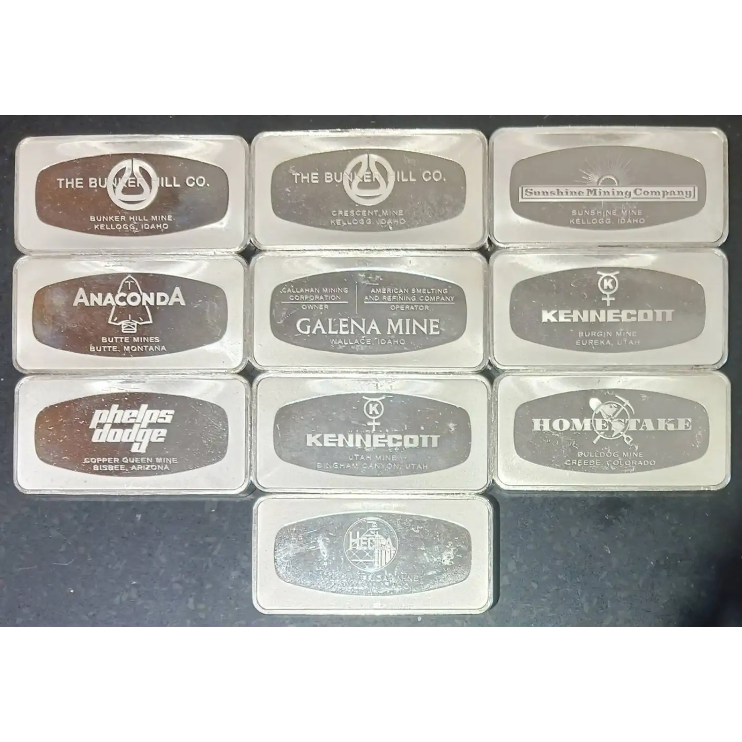 Here is the 1973 scarce edition of Franklin Mint's " The Great Silver-Producing Mines Of The American West. Each of the ten circulated condition bars weigh 4.167+ troy ounces of .999 silver each. These bars represent Butte Mines,Galena Mines,Bunker Hill Mine, Crecent Mine, Lucky Friday Mine, Bull dog Mine, Utah Mine, Burgin Mine, Copper Queen Mine and the Sunshine Mine. Five of the mines are Idaho bars.
