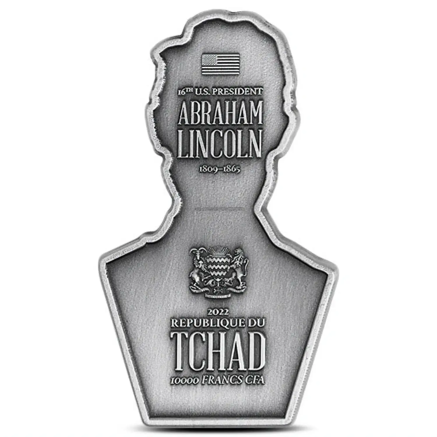 The obverse of 2022 2 oz Antique Silver Abraham Lincoln Shaped Coins features the Republic of Chad coat of arms. Above it is an American flag. Inscriptions read 16th U.S. President, Abraham Lincoln, 1809-1869. The coin’s year, country of origin and denomination are also listed below.