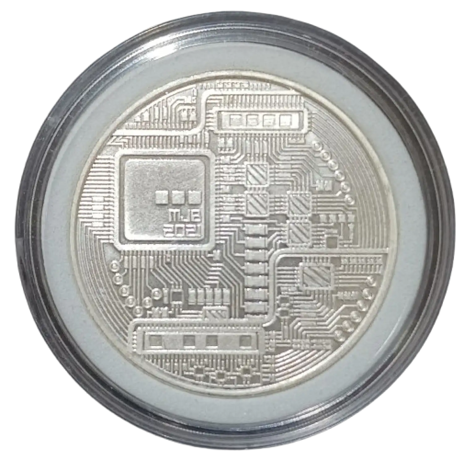 Reverse visuals on the 1 oz Crypto Commemorative Ethereum Silver Rounds include a common design theme found in many commemorative crypto collections. This design was first used back in 2011 when the first collectible crypto currency design was released. It seeks to recreate the appearance of computer hardware such as that which would be found in the processors running the blockchain network within which many crypto currencies originate. This side of the round includes a date mark along with the identifying hallmarks.