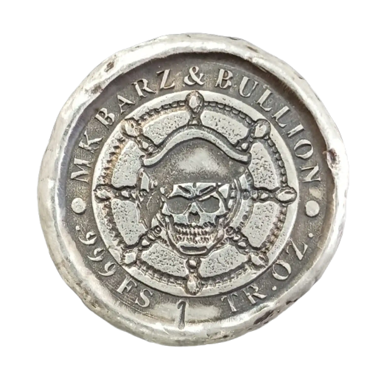 1 oz .999 Fine Silver Hand-Poured Pirate Skull Helm Round. Manufactured by MK BarZ. Limited Edition Round.