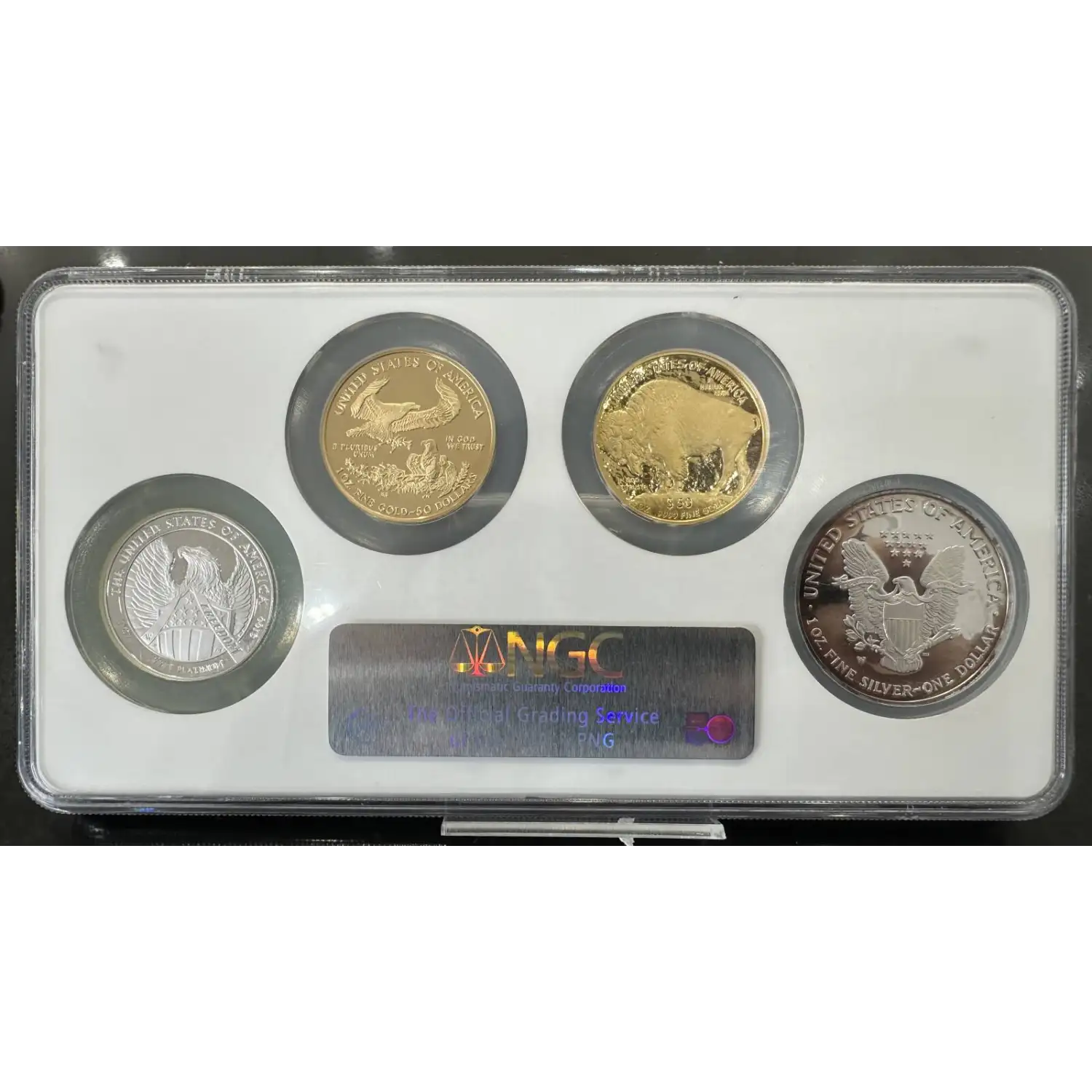 Coins included are 1oz American Gold Buffalo, 1oz American Gold Eagle, 1oz American Platinum Eagle, and 1oz American Silver Eagle.