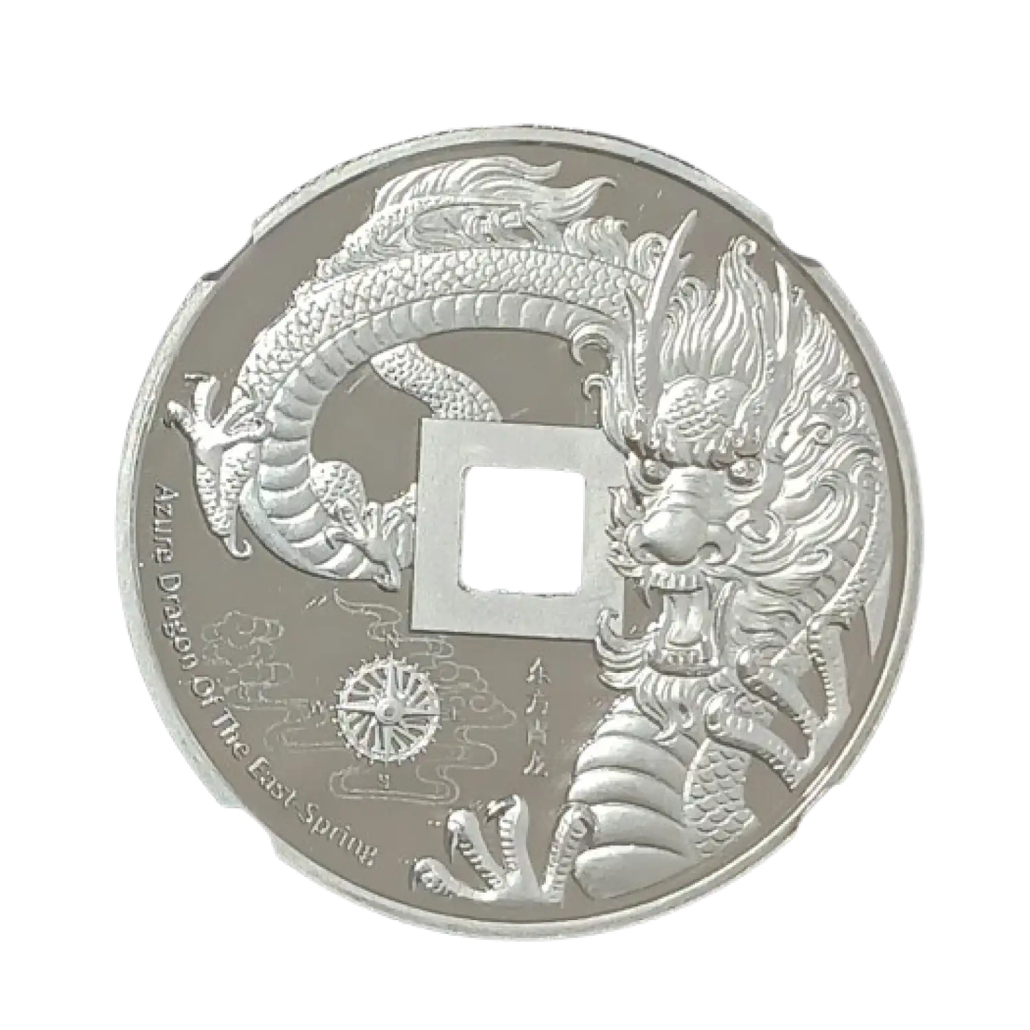 This China Azure Dragon Platinum Proof contains one ounce of .999 pure platinum. The obverse depicts the China Great Wall. The reverse side features the Azure Dragon of the East wrapping around the Cash Hole, ready to strike, and the compass.