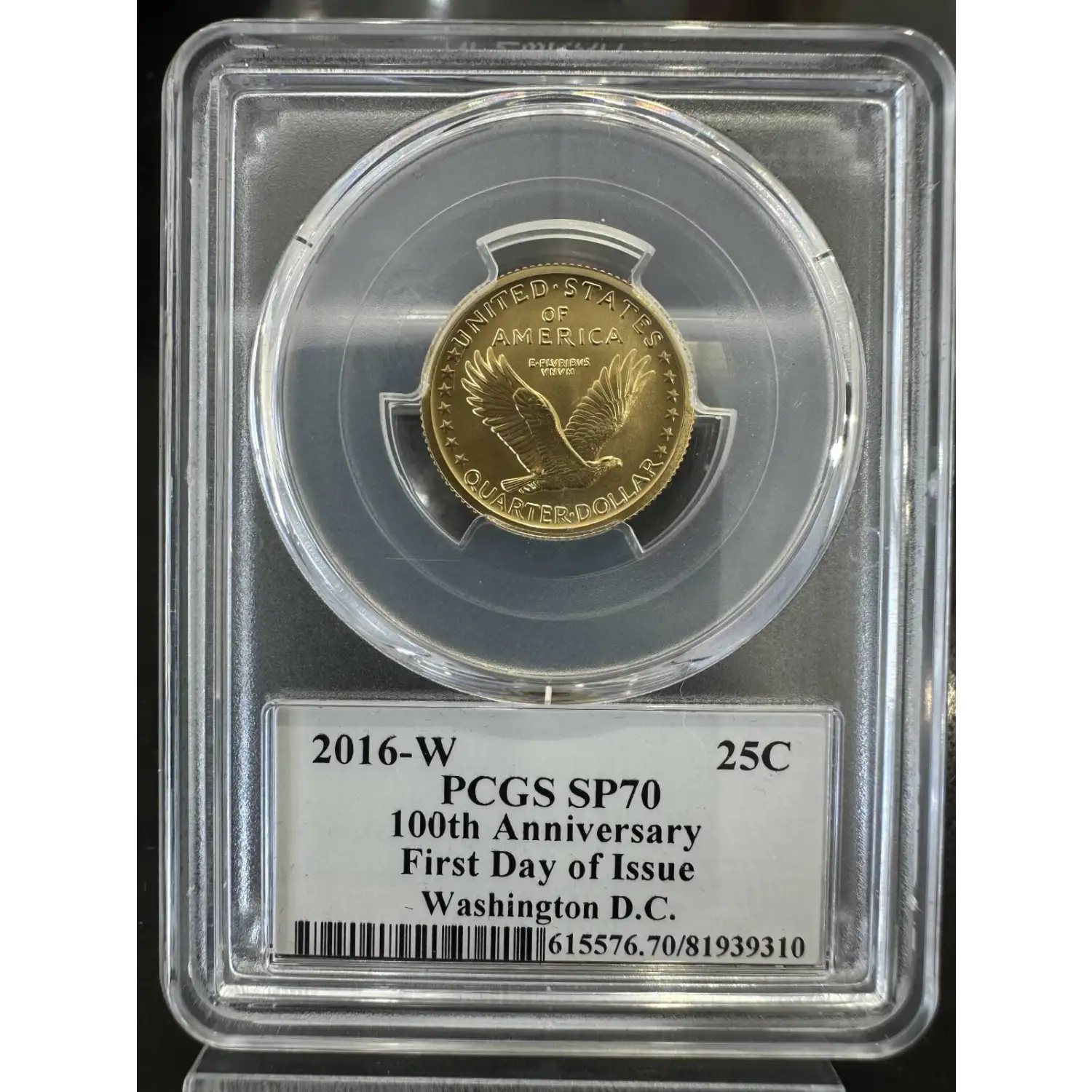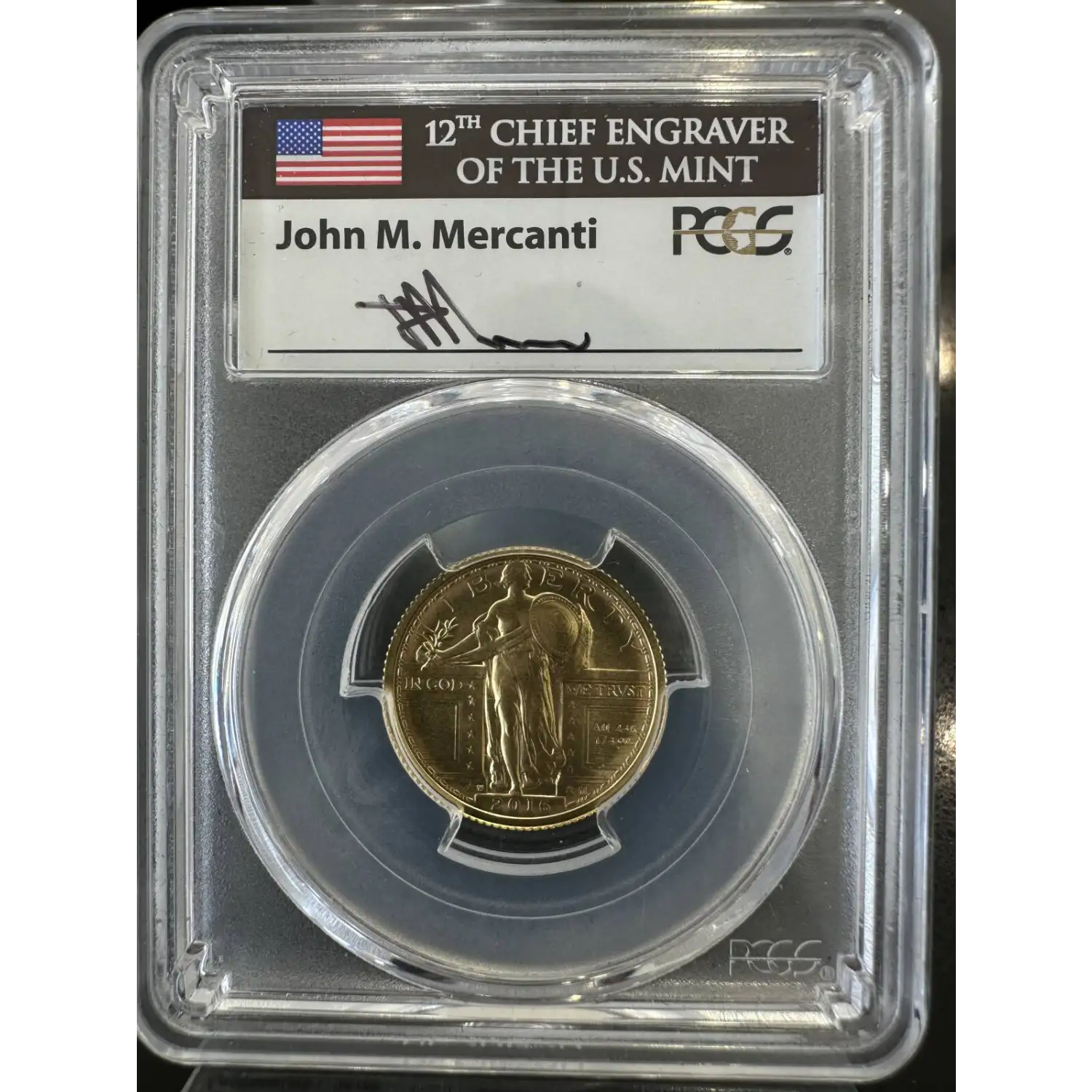 2016 W 25C 100th Anniversary Gold Standing Liberty Quarter Commemorative PCGS SP-70 First Day of Issue Washington DC John Mercanti Signed