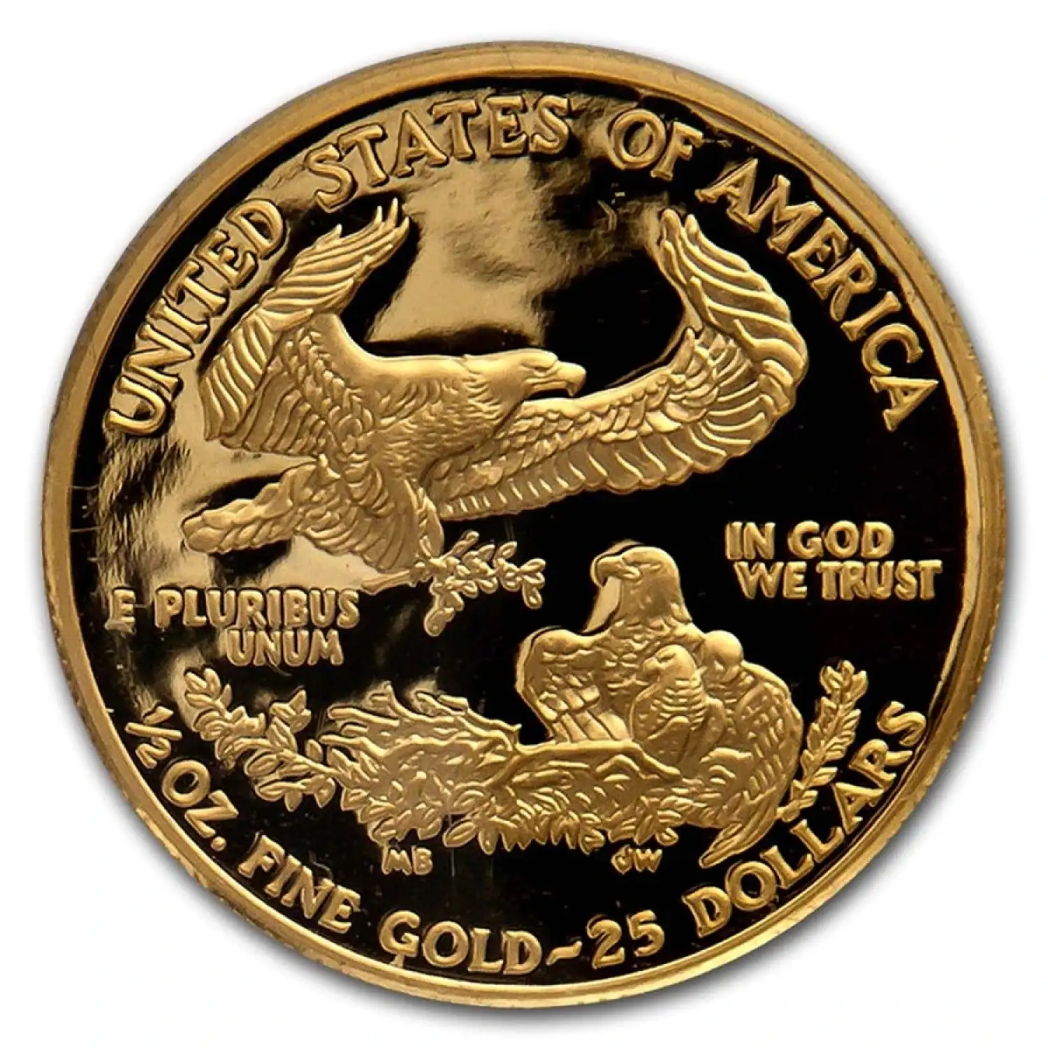 On the reverse of the 1/2 oz Proof American Gold Eagle is the image of the American bald eagle. In this design, there is a nest with a group of hatchlings under the watchful eye of a female bald eagle. A male bald eagle is shown flying overhead. This design is exclusive to the American Gold Eagle series and was created by Miley Busiek exclusively for these coins.