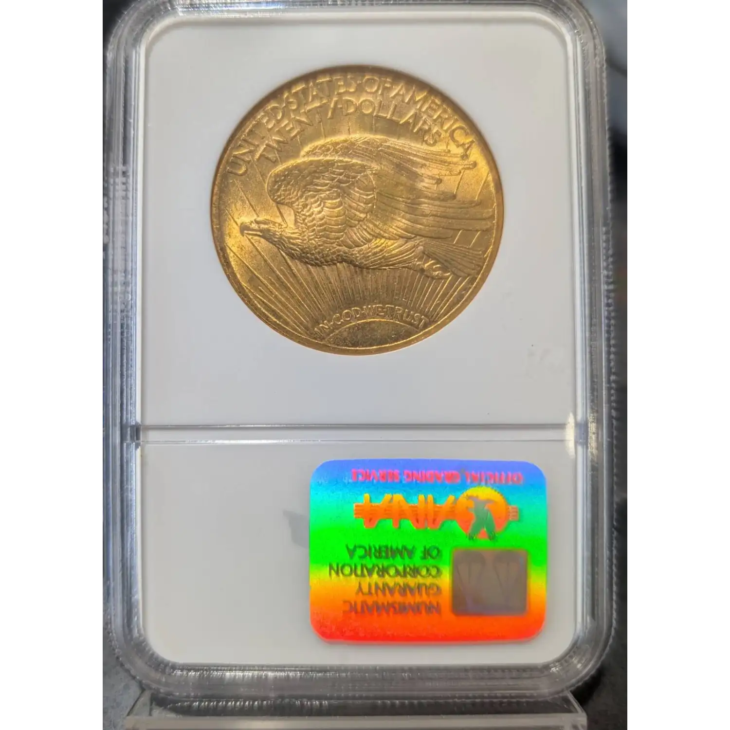 Reverse: A crescent sun appears at the bottom as if rising on the horizon with long rays extending to the top of the coin. A flying eagle covers the central portion, atop the rays. The words UNITED STATES oF AMERICA, TWENTY DOLLARS appear on the top periphery.