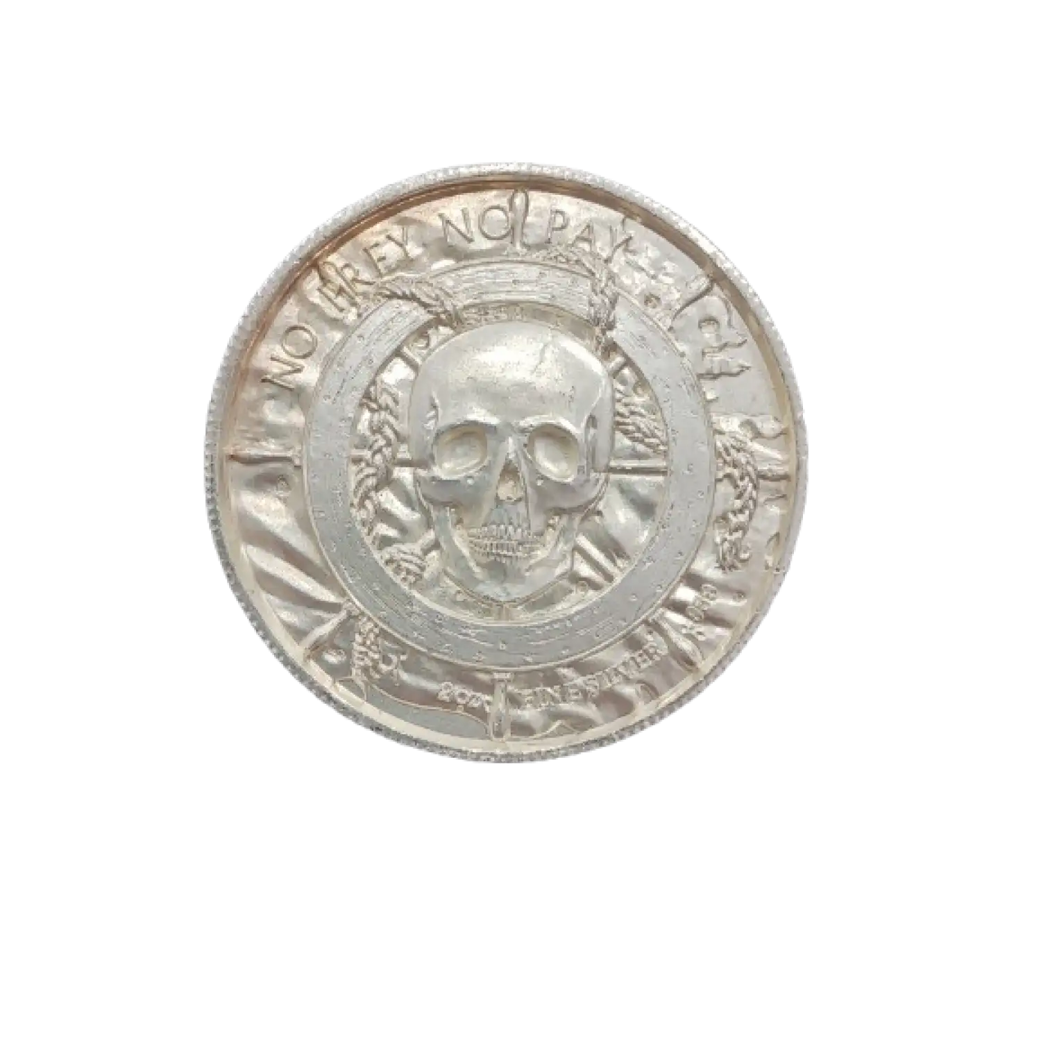 Embrace the allure of the Golden Age of Piracy with the captivating Silver 2 oz Pirates: No Prey No Pay Round . This masterpiece depicts a fearsome skeleton head of a pirate and features the iconic phrase "No Prey No Pay." Celebrate the spirit of adventure and add this unique investment-grade silver round to your treasure trove. A true gem for pirate enthusiasts and silver collectors alike.