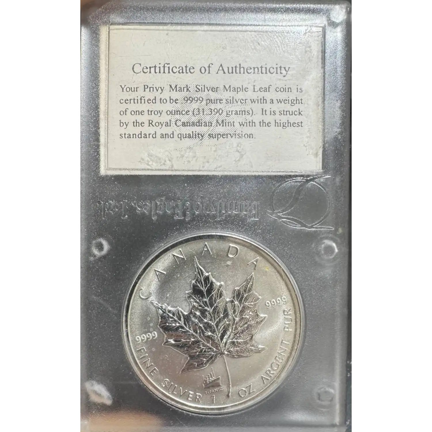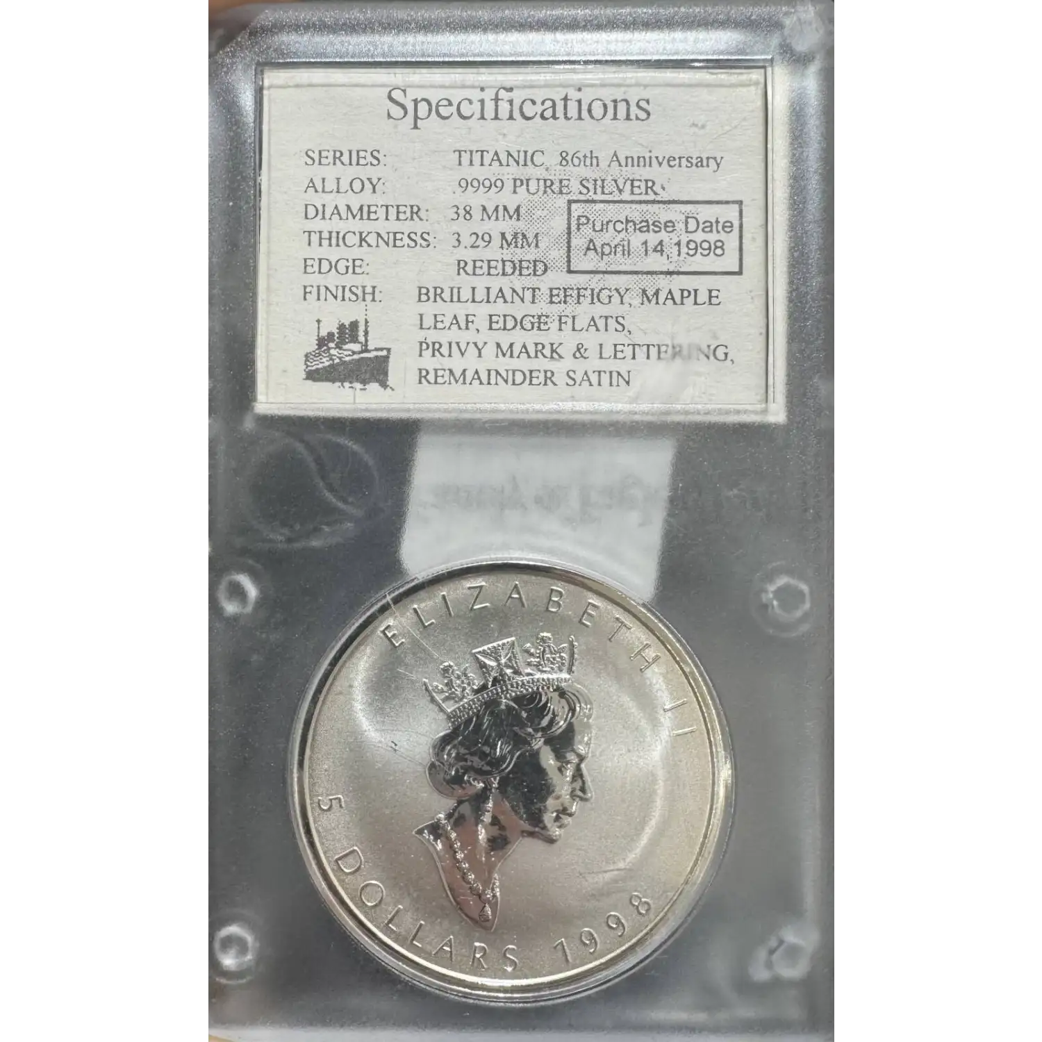 The 1998 1 oz Canadian Silver Maple Leaf Titanic Privy is composed of 1 oz of .9999 fine silver, celebrating the 80th anniversary of the famed Titanic voyage. The obverse of the coin depicts the right-facing profile of Queen Elizabeth II, along with the year and face value. The reverse portrays a detailed depiction of a single maple leaf and a privy mark of the RMS Titanic on the left of the maple leaf's stem.