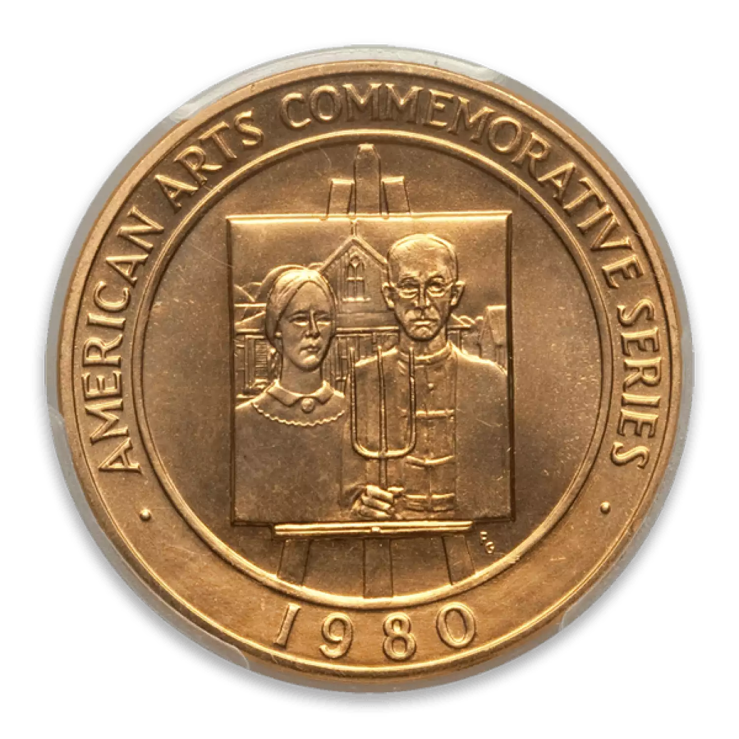 The American Gold Art Medallion 1oz was produced by US Mint and is composed of 1 troy ounce of .900 fine silver.The obverse of the coin features a different featured American artist each year. The reverse of the coin highlights each of the artist's achievement.The value of American Gold Art Medallion 1oz is primarily driven by the spot gold price at any given time.