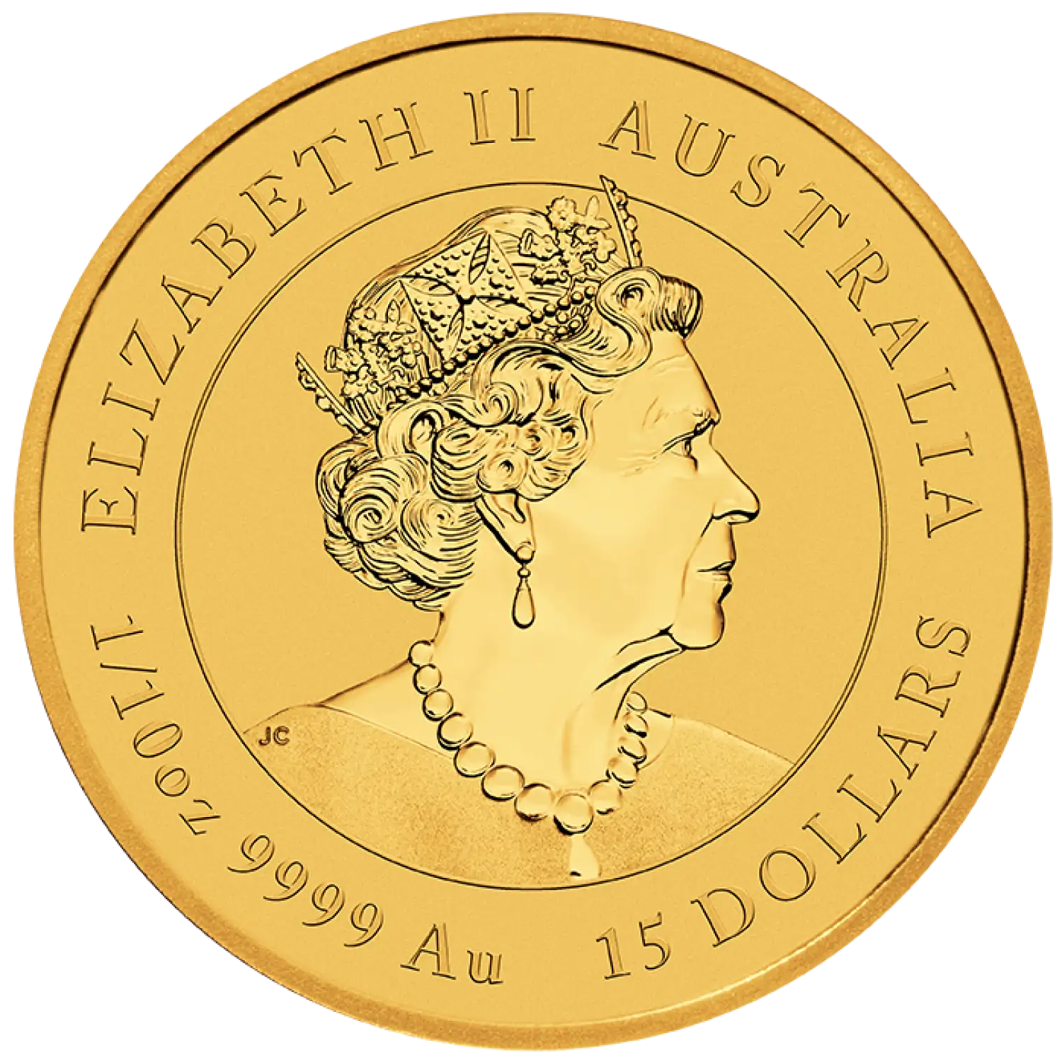 Designed by the Perth Mint, the Australian Gold Lunar coins are among the most magnificent coins in the world. These coins appeal to collectors and investors all over the world. Struck from .9999 fine Gold, the 2023 1/10 oz Australian Perth Mint Gold Lunar III: Year of the Rabbit is backed by the Australian government.The Obverse of the coin features Queen Elizabeth II as the coin was designed and started minting just before her death earlier this year. The reverse of this years coin features two rabbits beneath a bush. One sitting peacefully while the other gold rabbit is standing on its hind legs appearing to reach for berries on the bush above.