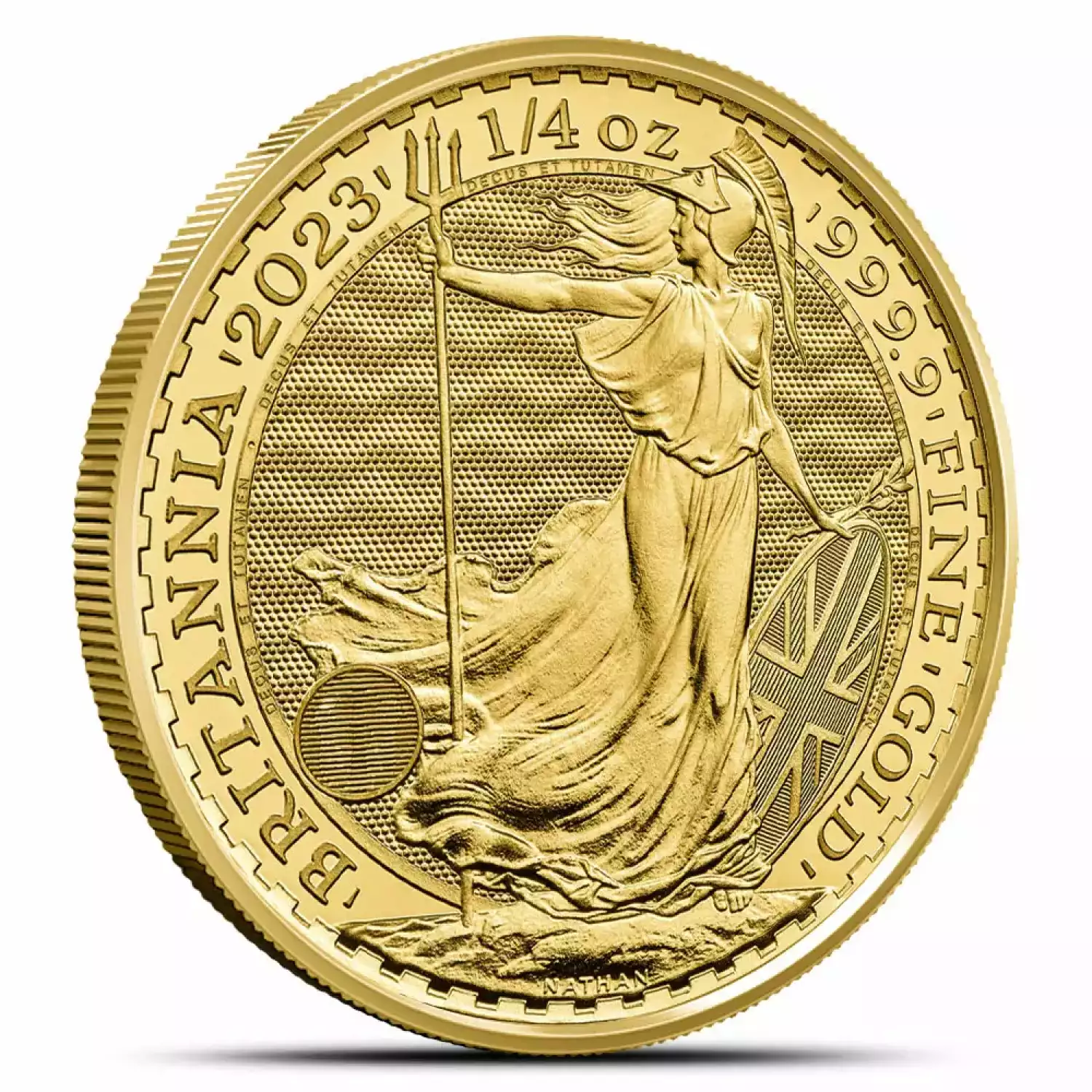 On its reverse side, Britannia stands in regal splendor. More than a mere figure, she embodies the essence of Britain. Her trident symbolizes authority, dominance, and the maritime supremacy of Britain. Imprinted inscriptions such as "BRITANNIA . 1/4 oz 9999 FINE Gold" underscore the coin's authenticity and value. For those with a discerning eye, the integrated security features seamlessly blend with the design, offering a marvel to behold.
