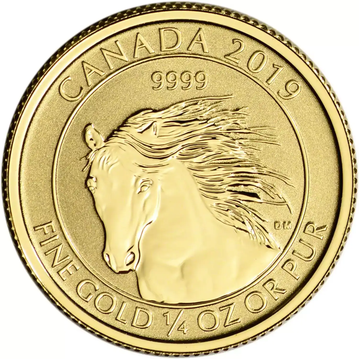 On the reverse of 2019 1/4 oz Canadian Gold Horse Reverse Proof Coins is the image of one of the magnificent members of this species. The Canadian Horse is prized for its strength and was chosen by many early settlers because it had the drive and riding strength to help conquer the unforgiving landscape of North America.