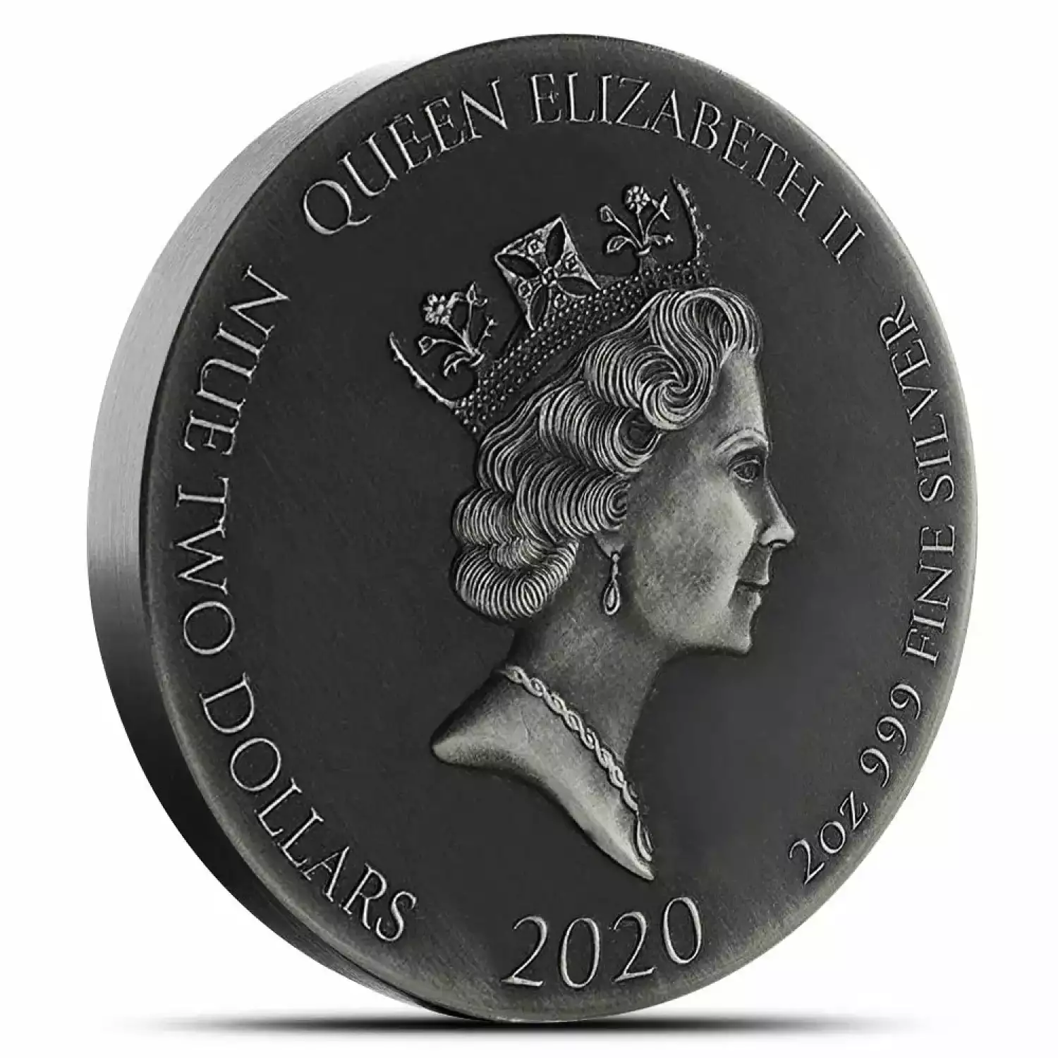 The obverse side of 2020 2 oz Destruction of Leviathan Biblical Silver Coins features a right-profile bust of Queen Elizabeth II. This is the third-generation portrait of the Queen created in 1985 by Raphael Maklouf and used briefly on British coins between 1985 and 1997. The effigy, notably, includes the George IV State Diadem Crown as the jewel piece on the Queen’s head.