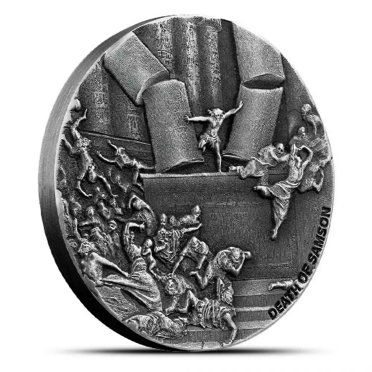 The reverse side of 2021 2 oz Death of Samson Silver Coins is a depiction of Samson pushing over the pillars supporting the temple where the Philistines had gathered to mock him during a performance. Samson had superhuman strength gifted to him by God, but his long hair was the source of his strength.