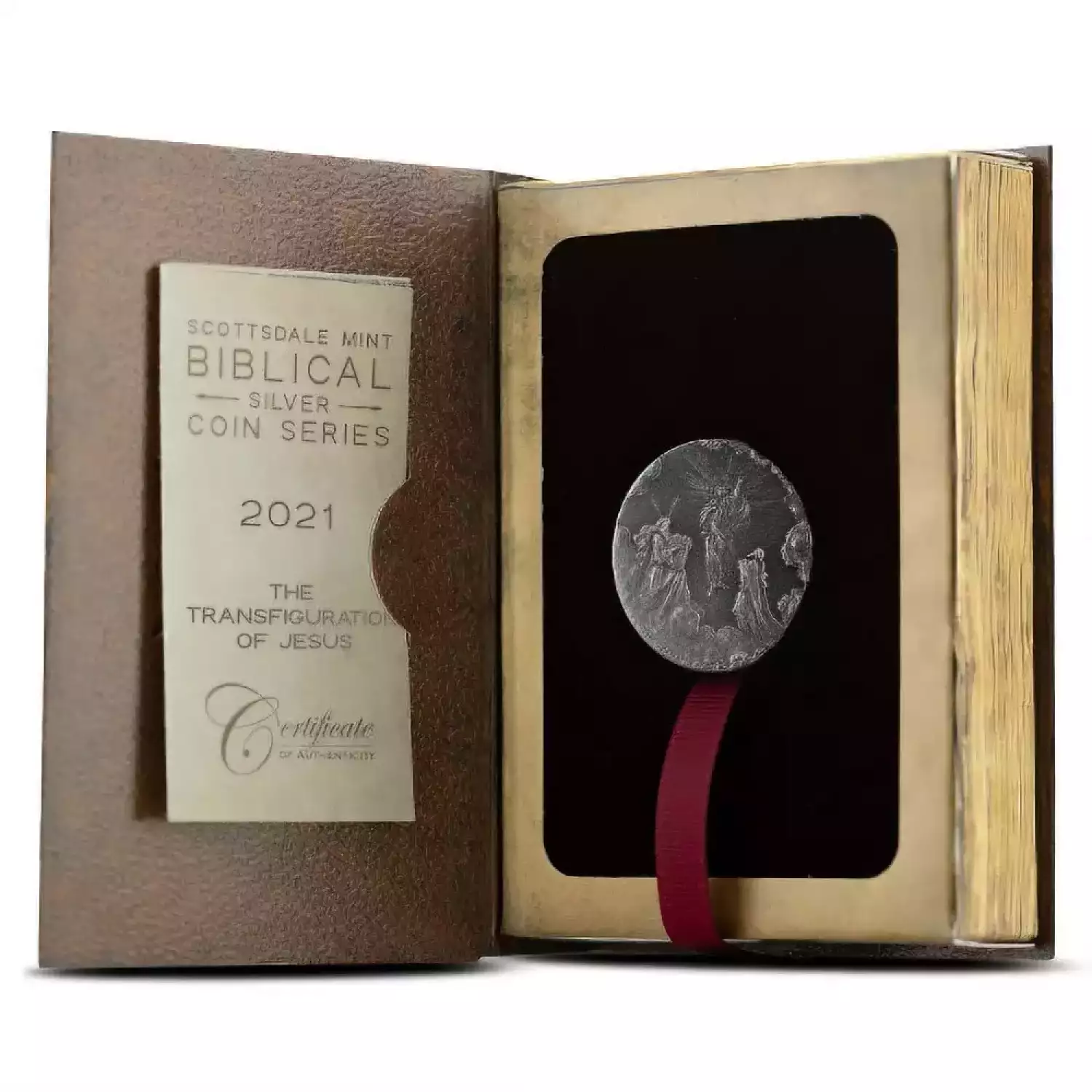 These 2021 2 oz Transfiguration of Jesus Biblical Silver Coins are available to you for purchase in Bible-inspired presentation boxes. The box includes a Certificate of Authenticity with relevant Bible verses printed on it related to the Transfiguration of Jesus. Each coin has an antique polish and was struck on a rimless blank to create an ancient appearance. The coins have individual serial numbers etched on the rim.
