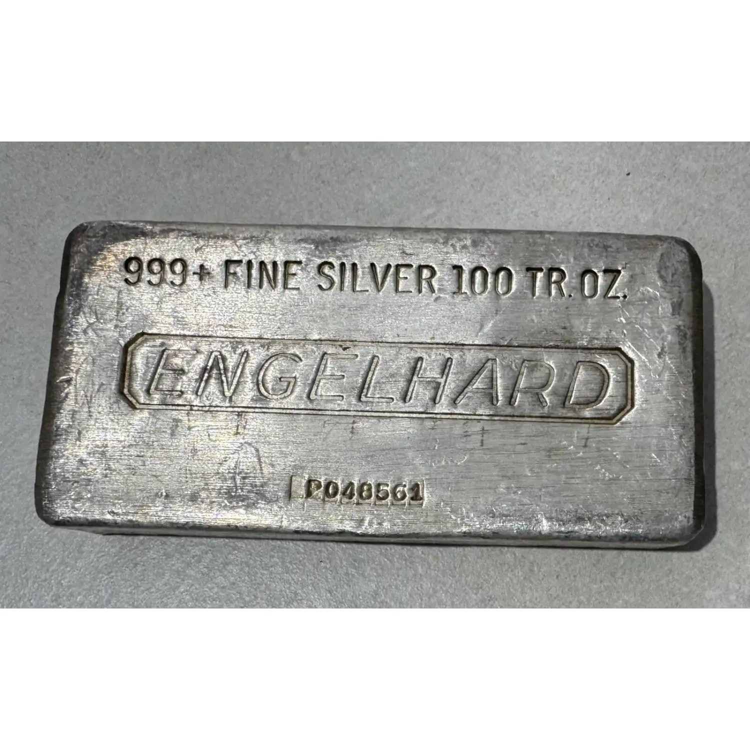 On the obverse side of Engelhard Hand Poured Silver Bars, you will find all of the identifying hallmarks. The traditional Engelhard logo is set at the center with the purity, metal content, and weight noted above. If these bars were assigned serial numbers, you will find that on this side of the bar as well. The reverse of each 100 oz Engelhard Hand Poured Silver Bar is blank.