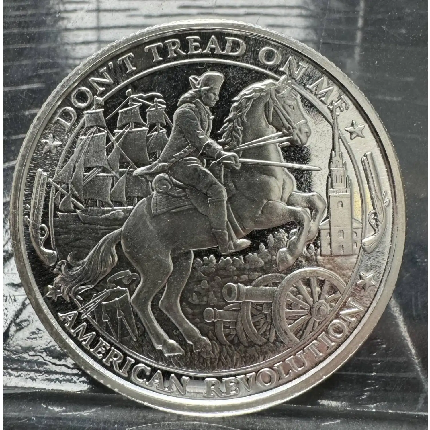 The obverse of these privately minted silver rounds features an iconic image of a revolutionary soldier on horseback with sword drawn. The phrase "Don't Tread on Me" is inscribed above the main design field.
