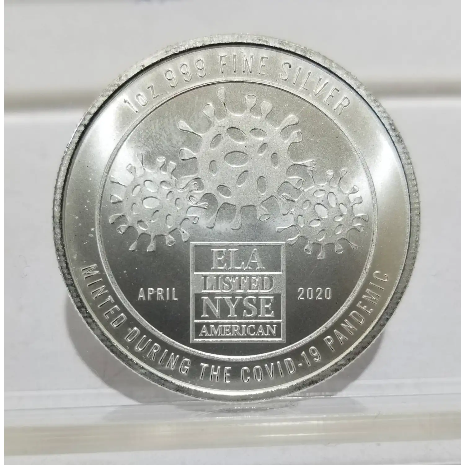 This 1 oz silver rounds features Covid-19 Virus design, minted by Envela in April 2020. The round is composed of 0.999 fineness silver. The design depicts COVID-19 virus, making it a great addition to any collection. The round is made in the United States and is a must-have for any precious metal enthusiast. (Minted During the Covid-19 Pandemic)