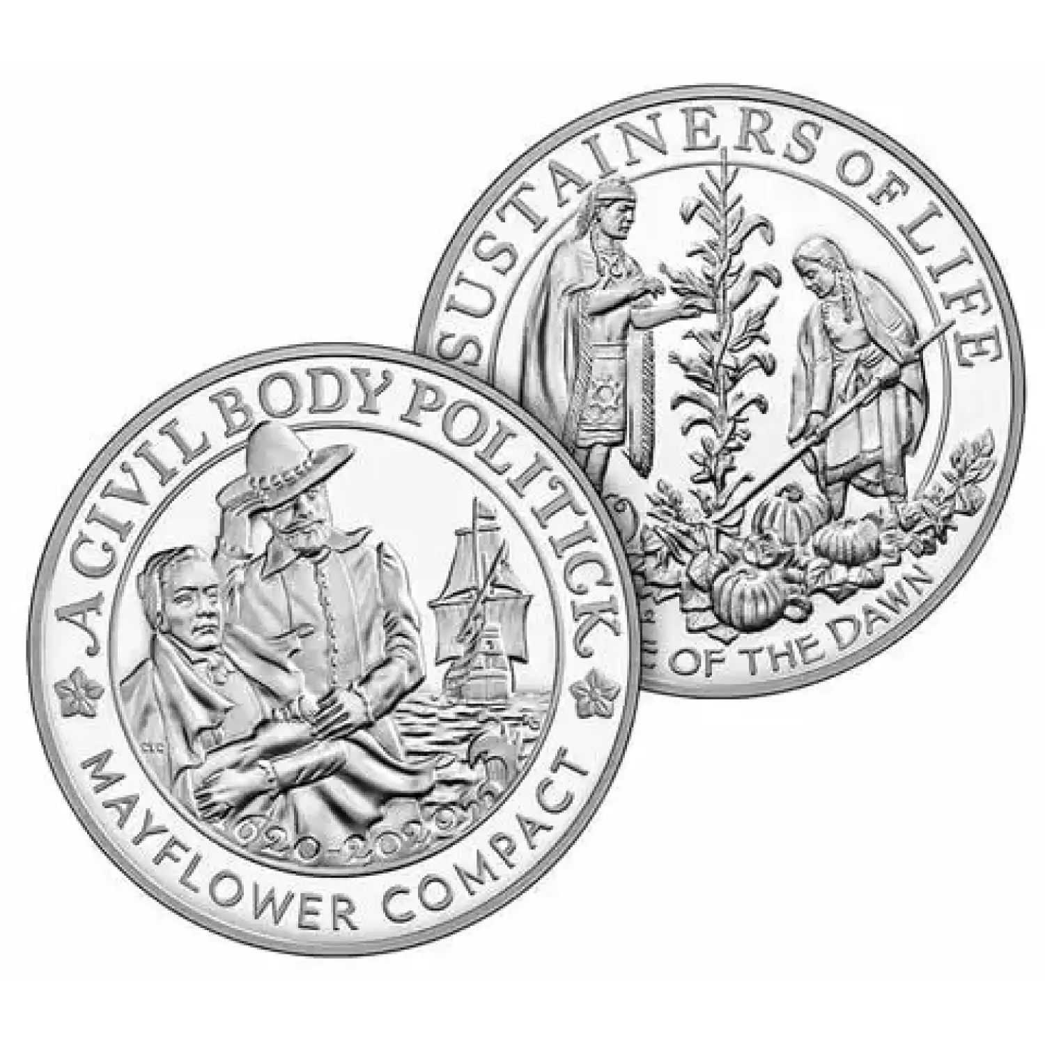 The United States Mint silver medal obverse features a Mayflower family bracing against the cold and windy weather, foreshadowing their coming hardships, while the ship is anchored in the harbor. A pair of mayflower blossoms flank the design. Inscriptions are “A CIVIL BODY POLITICK,” “1620-2020,” and “MAYFLOWER COMPACT.”