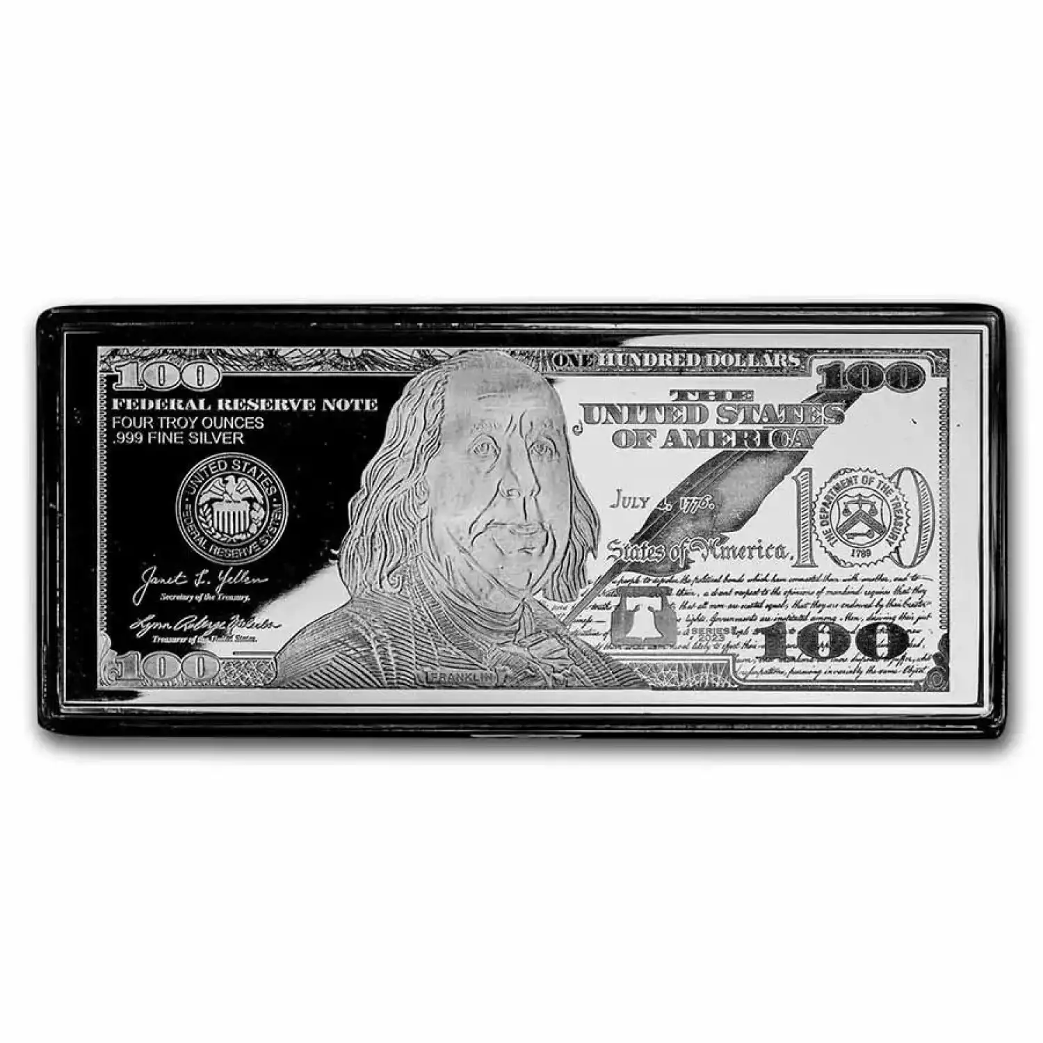 The Proof finish of these .999 fine Silver bars adds a beautiful sheen to iconic American imagery. This Silver bar features a replication of the $100 bill, with Benjamin Franklin on one side and Independence Hall on the other side.