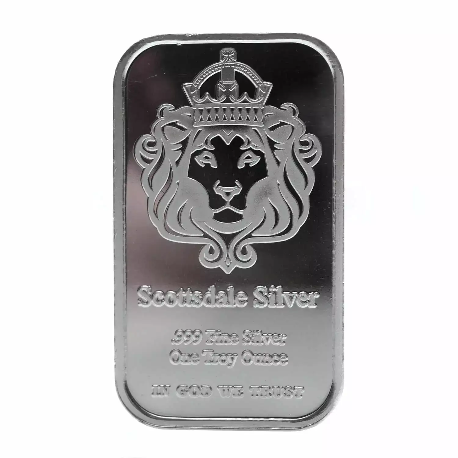 The One is here. More portable than a 10-ouncer, perfect for bartering and one of the most visually stunning pieces of silver bullion on the market today. Exceptionally minted and finished, the front features the illustrious Scottsdale Lion. The level of detail in the crown alone qualifies The One as the most intricately-etched 1-ounce bar available. A repeating Double S logo on the flip side adds to the elegance. Each bar is one ounce and sold individually. Shipped in plastic or bubble wrap depending on inventory. Brand New .999 Pure Silver MADE IN USA.