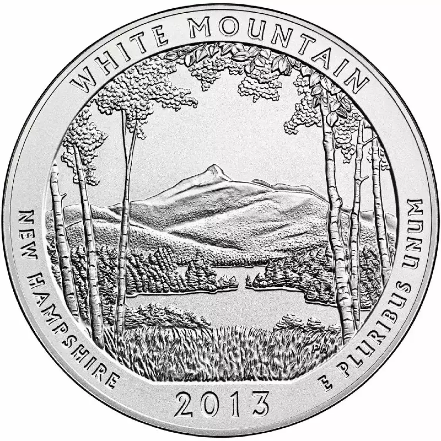 The renowned ‘America the Beautiful’ series is produced by the U.S. Mint and features America’s most celebrated landmarks and revered national parks. Each 2013 5 oz ATB White Mountain Silver Coin showcases New Hampshire’s enchanting White Mountain National Forest.