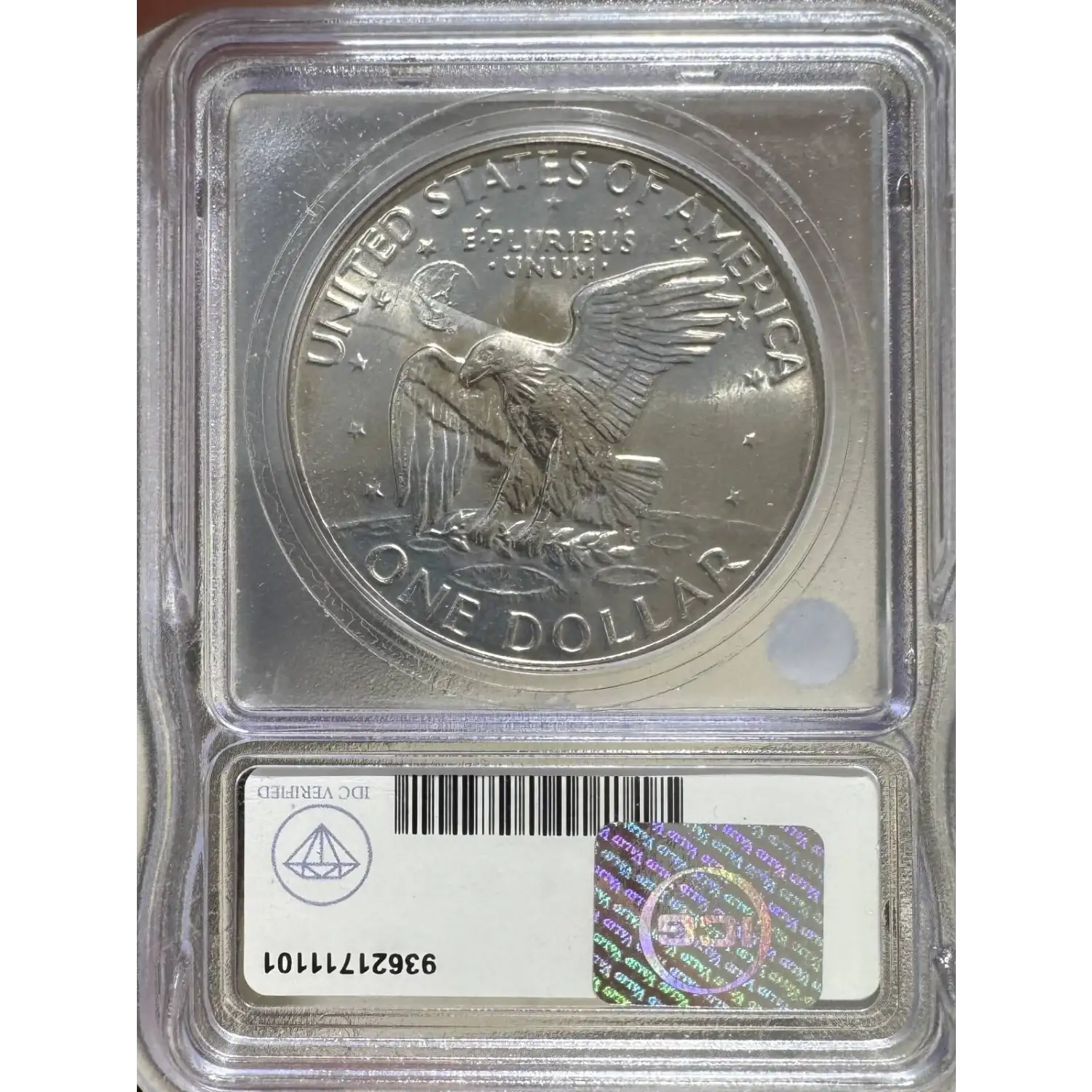 Reverse: A flying eagle, clutching olive branches, appears to be landing on the cratered moon, with the earth seen in the background. 13 stars surround the design with the words UNITED STATES OF AMERICA and ONE DOLLAR framing the periphery.
