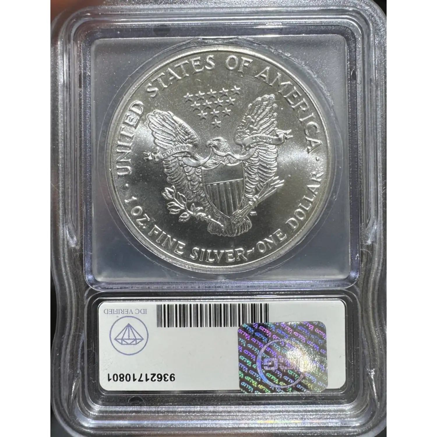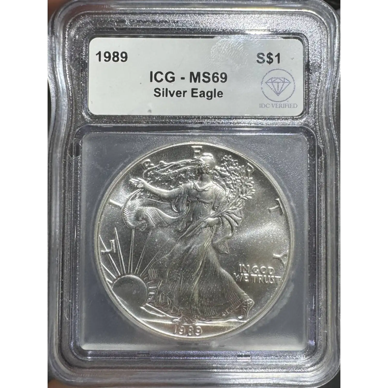 The 1989 One dollar is part of a series of Silver eagle coins struck from 1986-Present. The specific variety is Silver Eagle. Struck in Philadelphia and designated as a Business (MS) strike, this coin is made of 99.93% silver, 0.007% copper from a mintage of 5,203,327 struck.