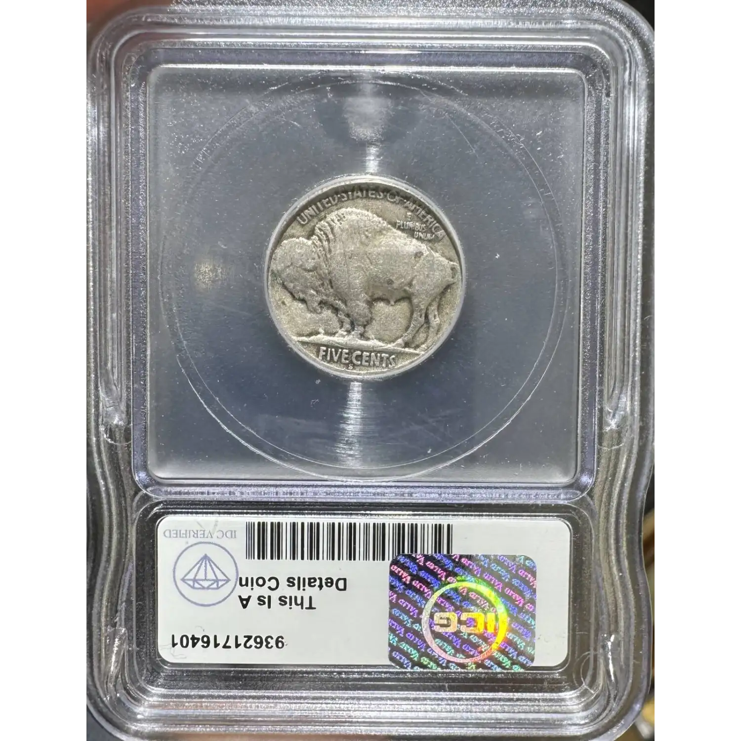 Reverse: A full portrait of the bison, Black Diamond, with the words UNITED STATES oF AMERICA at the top periphery with the motto E PLURIBUS UNUM just underneath. The denomination FIVE CENTS is spelled out at the bottom. For the Type 1, the denomination is embossed on a flat surface.