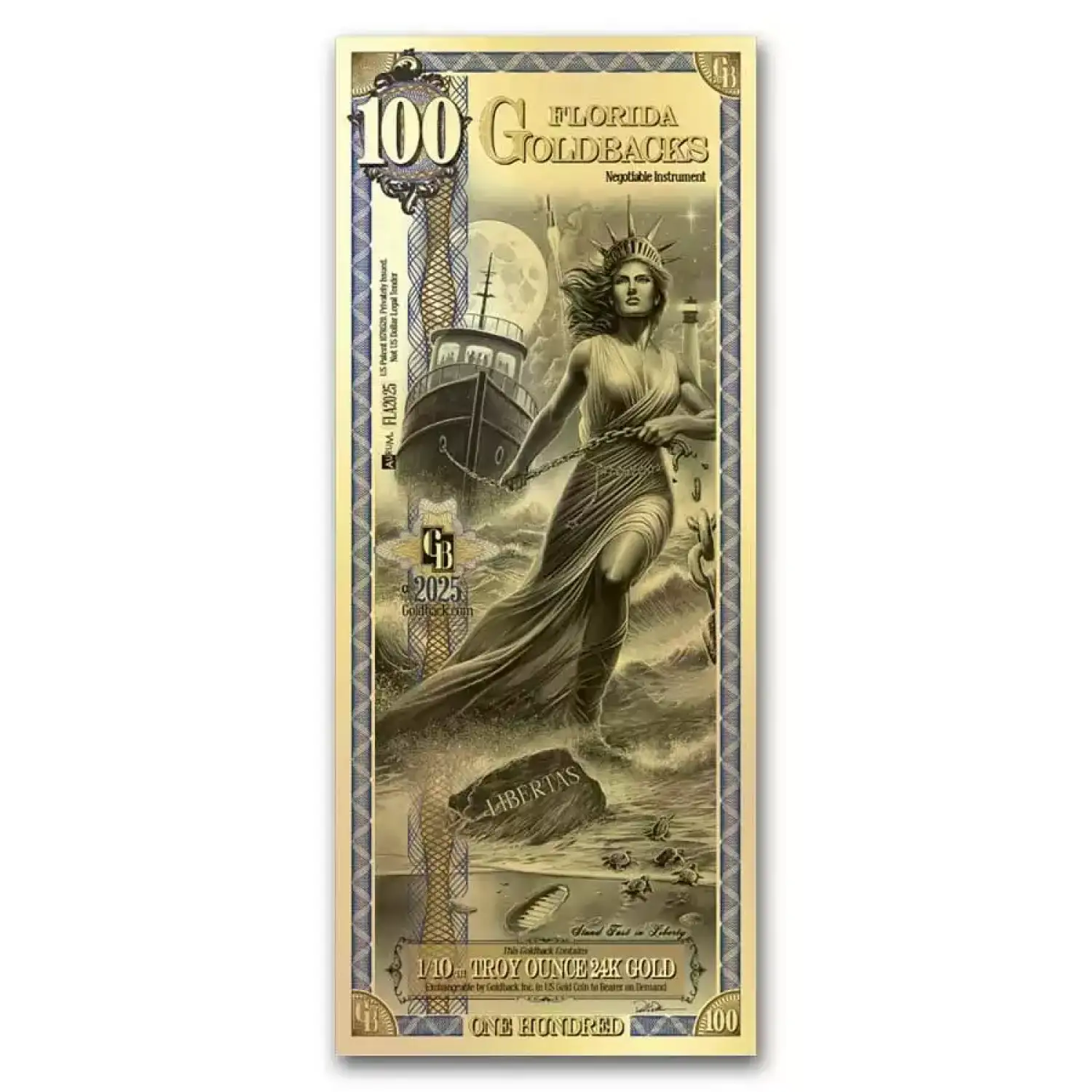 The Florida 100 Goldback features Libertas (Liberty), the capstone virtue symbolizing the timeless and universal pursuit of freedom. Inspired by the Roman goddess of liberty, Libertas is depicted pulling a weathered ship through turbulent waters, embodying resilience and compassion in the face of adversity. The design reflects the story of Cuban immigration to Florida, where countless individuals fled political oppression in Cuba during the mid-20th century, risking dangerous journeys to reach the safety and opportunity of Florida’s shores. Libertas is adorned with broken chains symbolizing sacrifice, a key necklace for unlocking freedom, and a seven-pointed crown representing the global aspiration for liberty. The scene incorporates symbols of Florida’s identity, including sea turtle hatchlings for resilience, the Cape Florida Lighthouse as a beacon of hope, and a rocket launching skyward to honor the state’s space legacy. Layered with meaning, the artwork celebrates the courage to overcome hardship, Florida’s role as a refuge, and the enduring spirit of those who strive for liberty and new horizons.