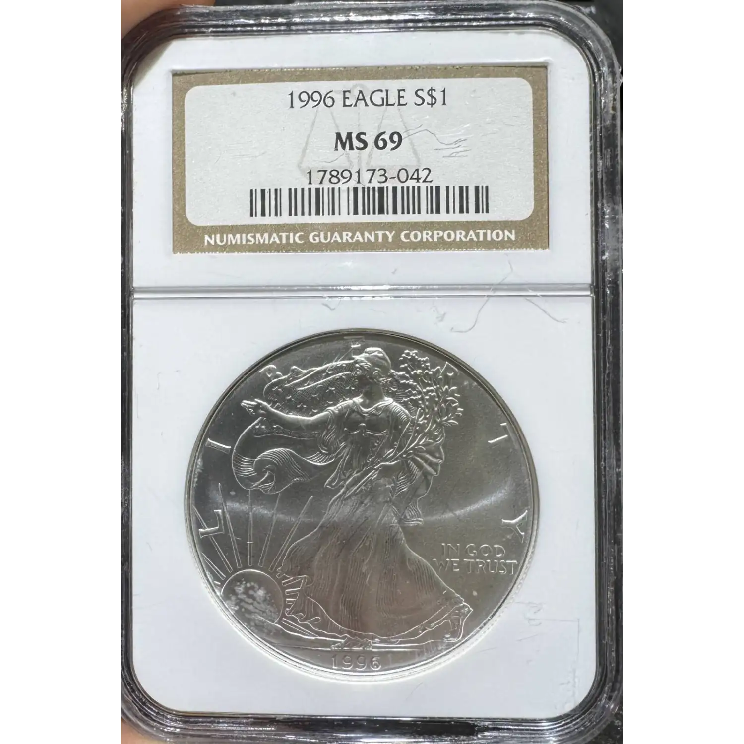 The 1996 One dollar is part of a series of Silver eagle coins struck from 1986-Present. The specific variety is Silver Eagle. Struck in Philadelphia and designated as a Business (MS) strike, this coin is made of 99.93% silver, 0.007% copper from a mintage of 3,603,386 struck.