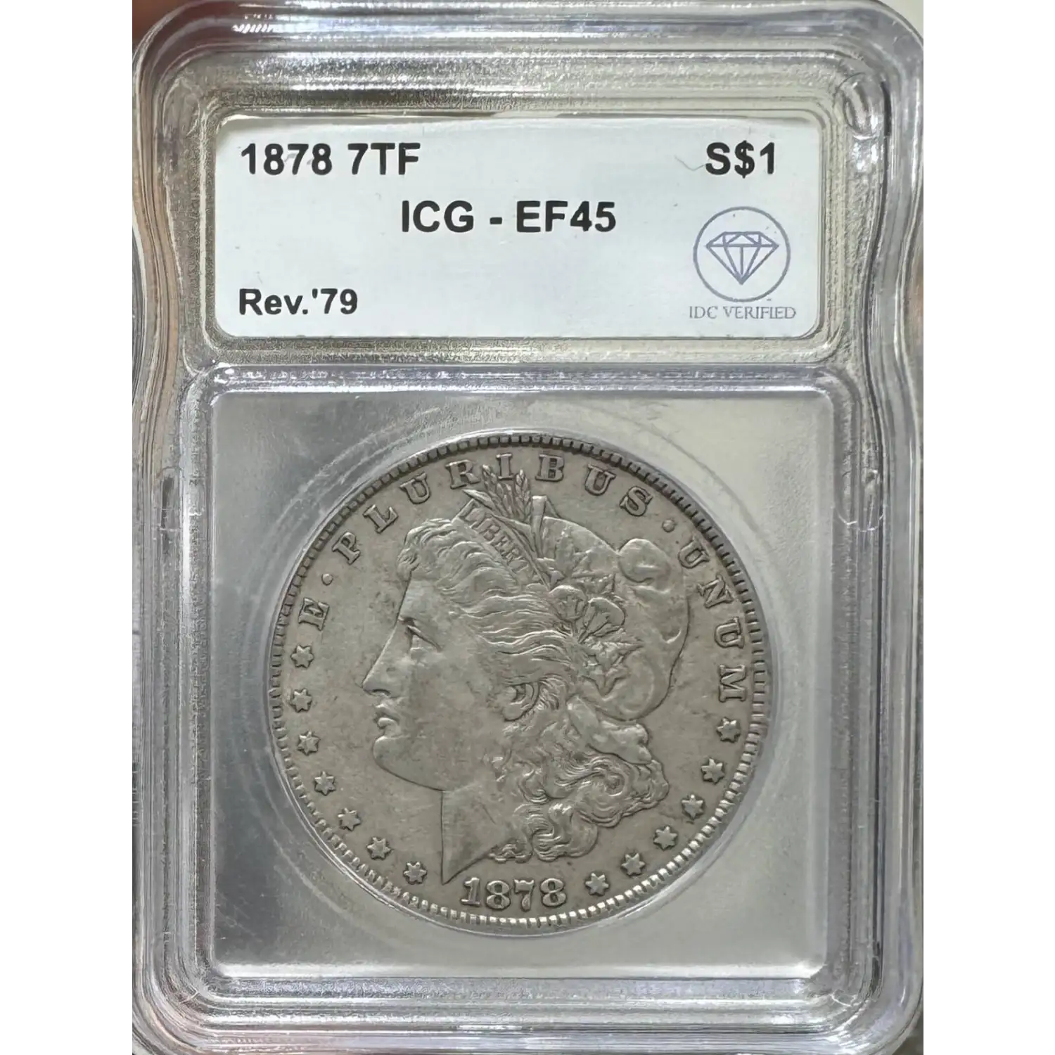 | Name | 1878 7TF Morgan Dollar ICG EF45 Rev '79 IDC Verified |